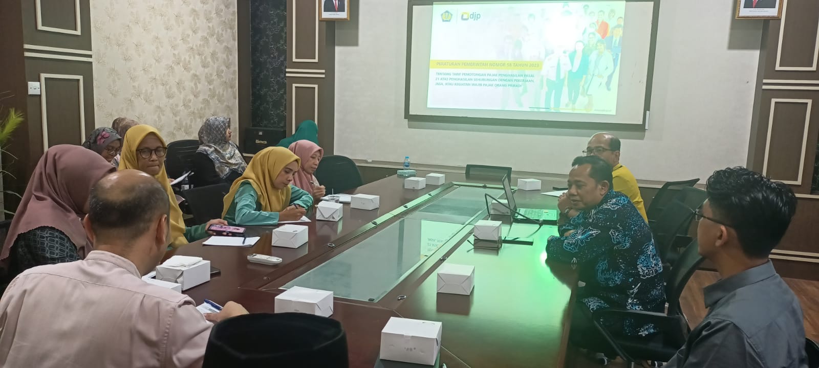 Kantor Wilayah Direktorat Jenderal Pajak Kepulauan Riau (Kanwil DJP Kepri) melakukan kunjungan kerja ke Badan Keuangan dan Aset Daerah (BKAD) Provinsi Kepri di Kota Tanjung Pinang (Jum’at, 2/2). Kunjungan bertujuan untuk memberi edukasi peraturan perpajakan terbaru yaitu Peraturan Pemerintah (PP) Nomor 58 Tahun 2023 tentang Tarif Pemotongan Pajak Penghasilan Pasal 21 atas Penghasilan Sehubungan dengan Pekerjaan, Jasa, atau Kegiatan Wajib Pajak Orang Pribadi. Kegiatan dimulai pada Pukul 14.00 sampai dengan Pukul 17.00 bertempat di ruang rapat Kantor BKAD Kepri yang berlokasi di Komplek Kantor Gubernur Kepri, Dompak Kota Tanjung Pinang.