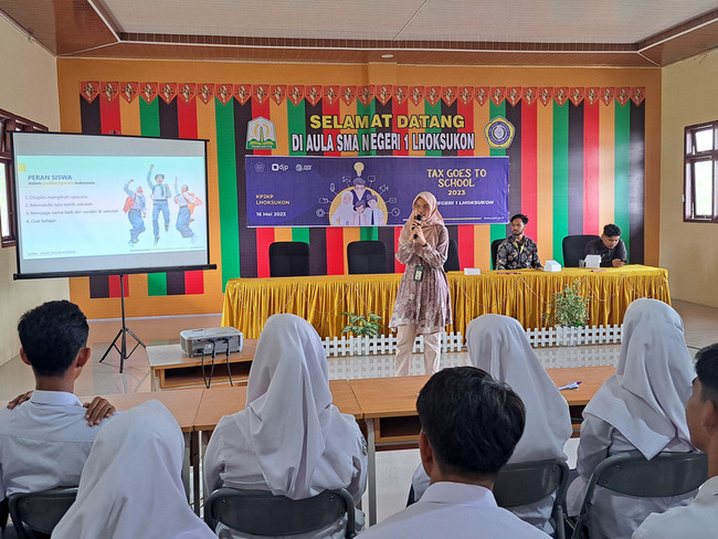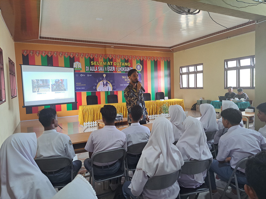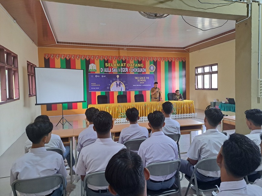 Kantor Pelayanan Pajak (KPP) Pratama Lhokseumawe dan Kantor Pelayanan, Penyuluhan, dan Konsultasi Perpajakan (KP2KP) Lhoksukon melakukan kerja sama dalam mengadakan kegiatan Tax Goes To School (TGTS). Kegiatan ini bertempat di Aula Sekolah Menengah Atas Negeri (SMAN) 1 Lhoksukon (Selasa, 16/5). Peserta kegiatan terdiri dari 30 siswa dari kelas 1 dan kelas 2 yang didampingi oleh perwakilan guru dari sekolah. Acara dibuka oleh Kepala Sekolah SMAN 1 Lhoksukon Hasbi yang menyampaikan tentang pentingnya pajak bagi pembangunan negara.