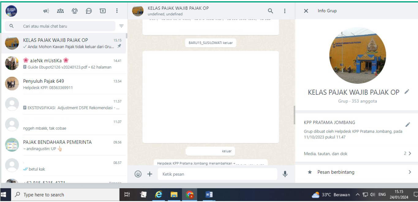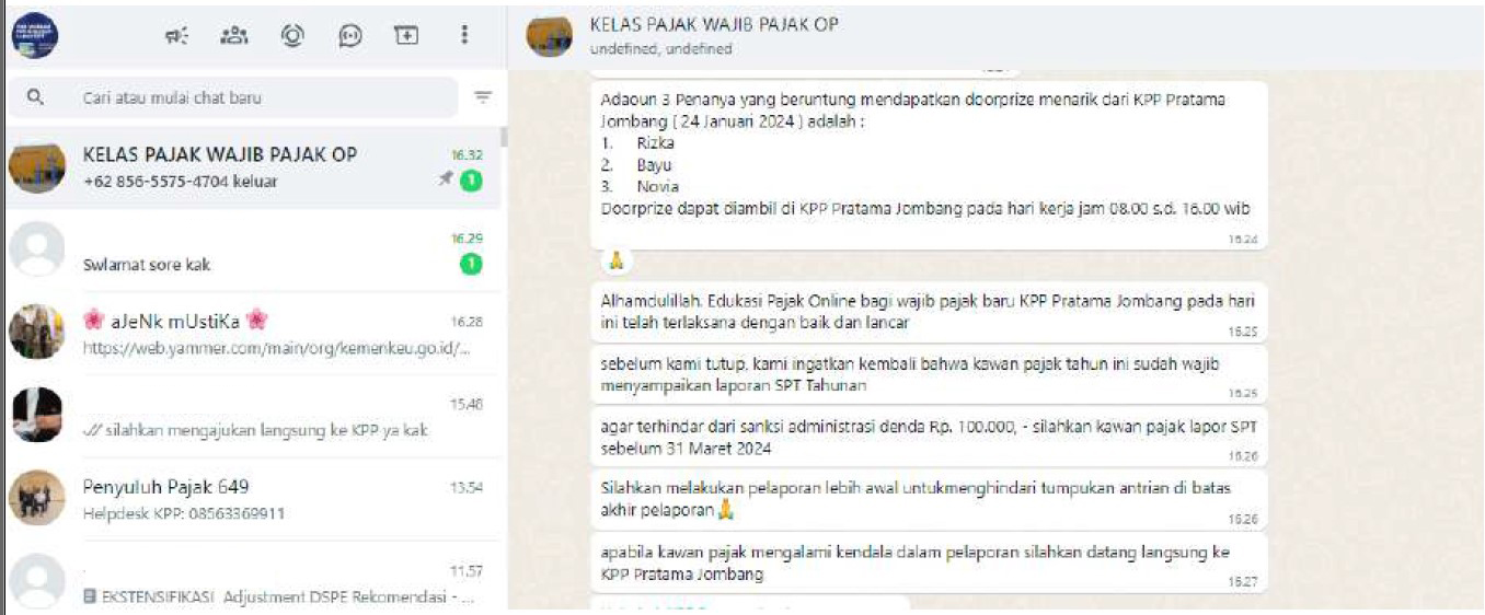 Eka, wajib pajak asal Kecamatan Bareng Kabupaten Jombang, berpartisipasi aktif dalam kelas pajak dengan materi hak dan kewajiban perpajakan orang pribadi (Rabu, 24/1). Kelas pajak yang dihadiri oleh 350 wajib pajak orang pribadi ini diselenggarakan oleh Kantor Pelayanan Pajak (KPP) Pratama Jombang secara daring.