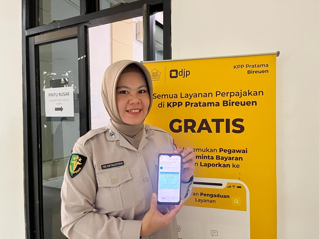 Petugas KPP Pratama Bireuen menyambut kedatangan Tri Oktagustina dan membantu wajib pajak tersebut melakukan pelaporan SPT Tahunan. Salshabilah Rimadina Putri, petugas KPP Pratama Bireuen, memandu wajib pajak dalam mengisi komponen-komponen pelaporan SPT Tahunan melalui laman pajak.go.id hingga wajib pajak menerima Bukti Penerimaan Elektronik.