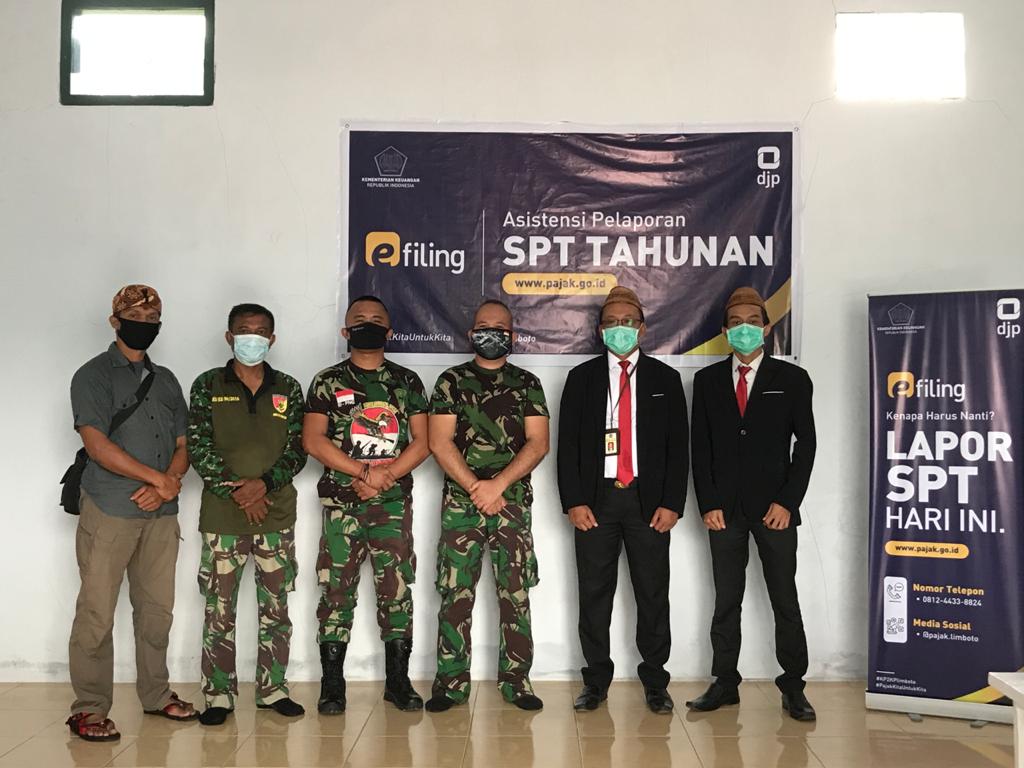 Kantor Pelayanan, Penyuluhan dan Konsultasi Perpajakan (KP2KP) Limboto menyelenggarakan Sosialisasi Perpajakan dan Asistensi Pelaporan SPT Tahunan dengan e-Filing di Rumkit Tingkat IV 13.08.01 Gorontalo (Senin, 25/1). Kegiatan ini dihadiri oleh seluruh anggota TNI Angkatan Darat yang bertugas di Rumkit Tingkat IV 13.08.01 Gorontalo.