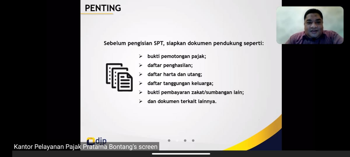 Kantor Pelayanan Pajak (KPP) Pratama Bontang menggelar Kelas Pajak bertema Tata Cara Pelaporan SPT Tahunan Orang Pribadi Karyawan secara daring melalui Aplikasi Zoom Meeting di Kota Bontang (Kamis, 10/3). Kegiatan Kelas Pajak berlangsung dari pukul 09.00 WITA sampai dengan 11.00 WITA.
