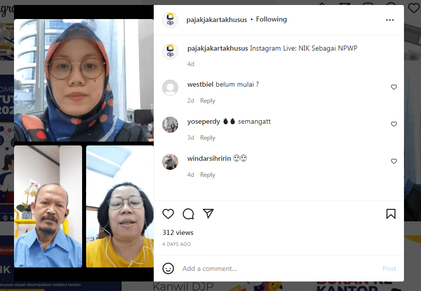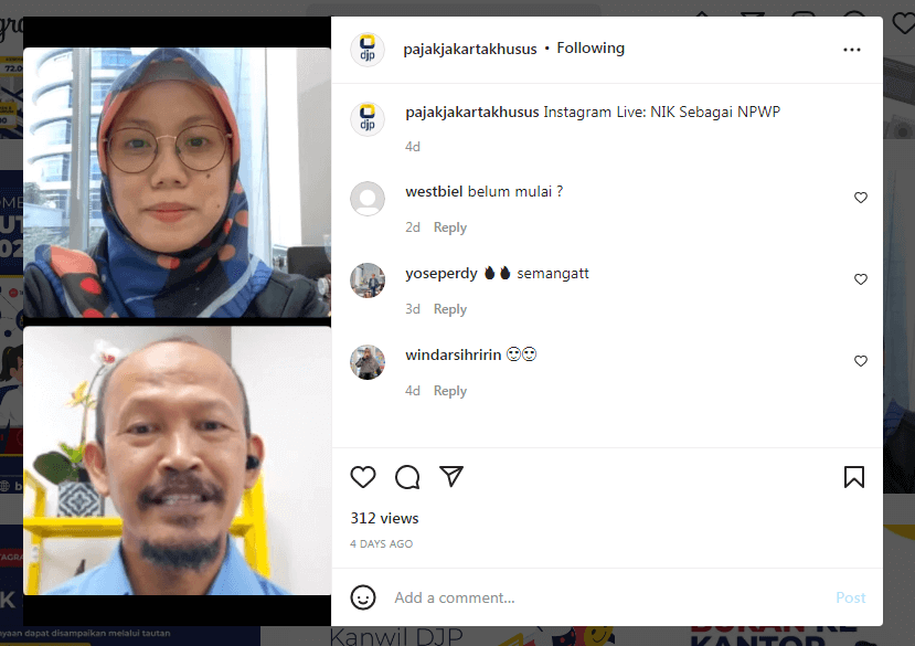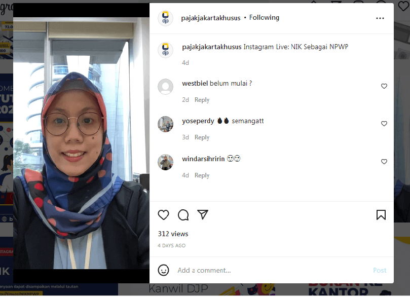 Kanwil DJP Jakarta Khusus menyelenggarakan kelas pajak mengenai topik yang sedang ramai diperbincangkan di berbagai media yaitu seputar NPWP yang berubah penomorannya menjadi NIK. Kelas Pajak ini dilakukan melalui Live Instagram pukul 16.00 s.d. 16.45 WIB (Rabu, 28/7).