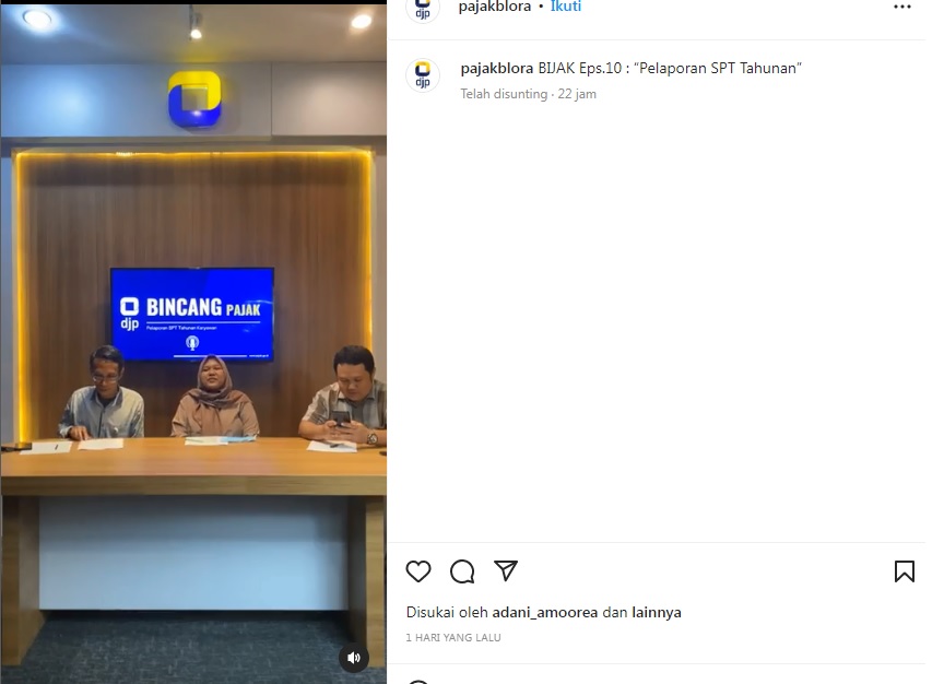 Materi dibawakan oleh Tim Penyuluh KPP Pratama Blora, membahas tentang Pelaporan Surat Pemberitahuan (SPT) Tahunan untuk karyawan menjelang 21 hari hingga batas akhir penyampaian SPT Tahunan Orang Pribadi tahun 2022. Dalam Live Instagram ini Tim Penyuluh KPP Pratama Blora mengingatkan wajib pajak juga melakukan pemutakhiran data mandiri melalui kanal DJP Online.
