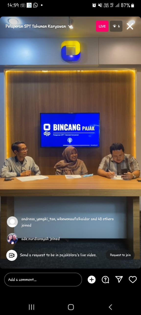 Kantor Pelayanan Pajak (KPP) Pratama Blora menyapa wajib pajak di Instagram melalui fitur Live di akun @pajakblora di Kab. Blora (Kamis, 09/03). Kegiatan berlangsung selama 60 menit.