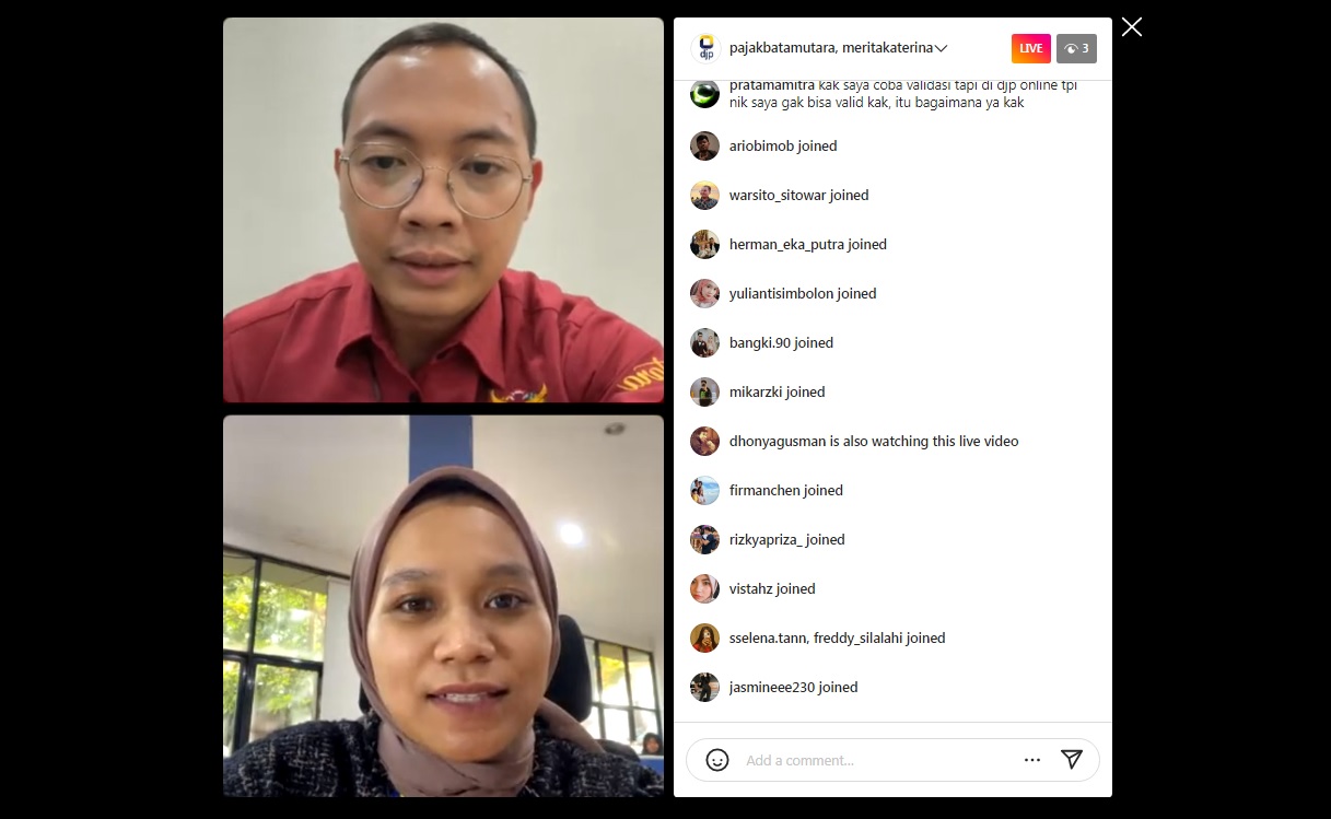 Kantor Pelayanan Pajak (KPP) Pratama Batam Utara kembali memberi edukasi kepada wajib pajak dalam acara Sudut Ngopi 215: Perubahan Format NIK (Nomor Induk Kependudukan) sebagai NPWP (Nomor Pokok Wajib Pajak) melalui live Instagram @pajakbatamutara di Batam, Kepulauan Riau (Kamis, 19/11). Acara dipandu oleh Landung Wicaksana, dengan narasumber Penyuluh Pajak Merita Katrina Sari.
