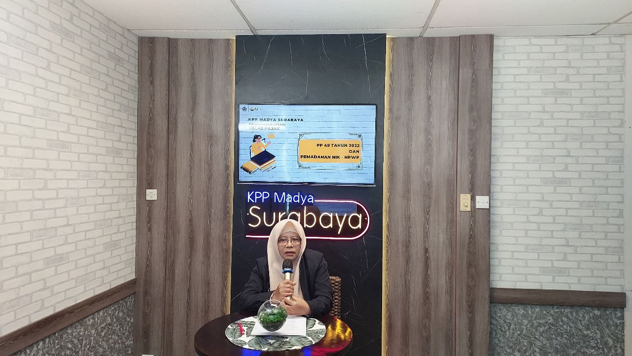 Kantor Pelayanan Pajak (KPP) Madya Surabaya menyelenggarakan Sosialisasi Pemadanan NIK menjadi NPWP dan Peraturan Pemerintah (PP) Nomor 49 Tahun 2022 tentang Pajak Pertambahan Nilai Dibebaskan dan Pajak Pertambahan Nilai atau Pajak Pertambahan Nilai dan Pajak Penjualan atas Barang Mewah Tidak Dipungut atas Impor dan/atau Penyerahan Barang Kena Pajak Tertentu dan/atau Penyerahan Jasa Kena Pajak Tertentu dan/atau Pemanfaatan Jasa Kena Pajak Tertentu dari Luar Daerah Pabean, di Surabaya (Kamis, 26/1).