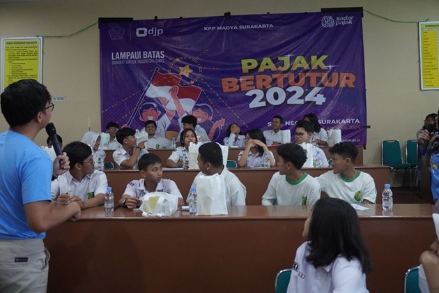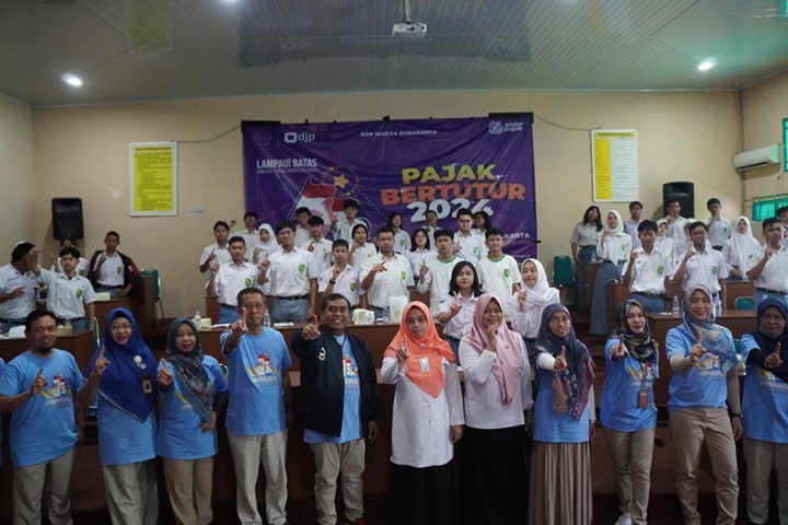 Kantor Pelayanan Pajak (KPP) Madya Surakarta menyambangi SMA Negeri 1 Surakarta untuk melaksanakan kegiatan Pajak Bertutur 2024, Rabu (7/8). Pajak Bertutur dilaksanakan dalam rangka mengampanyekan program inklusi kesadaran pajak dalam pendidikan dan peringatan hari kemerdekaan RI yang ke-79. Kegiatan ini diikuti oleh 44 siswa dan siswi kelas X-XII SMA Negeri 1 Surakarta sebagai peserta dan didampingi oleh 3 orang guru. Pajak Bertutur tahun ini mengusung tema “Lampaui Batas untuk Bangkit Menuju Indonesia Emas.”