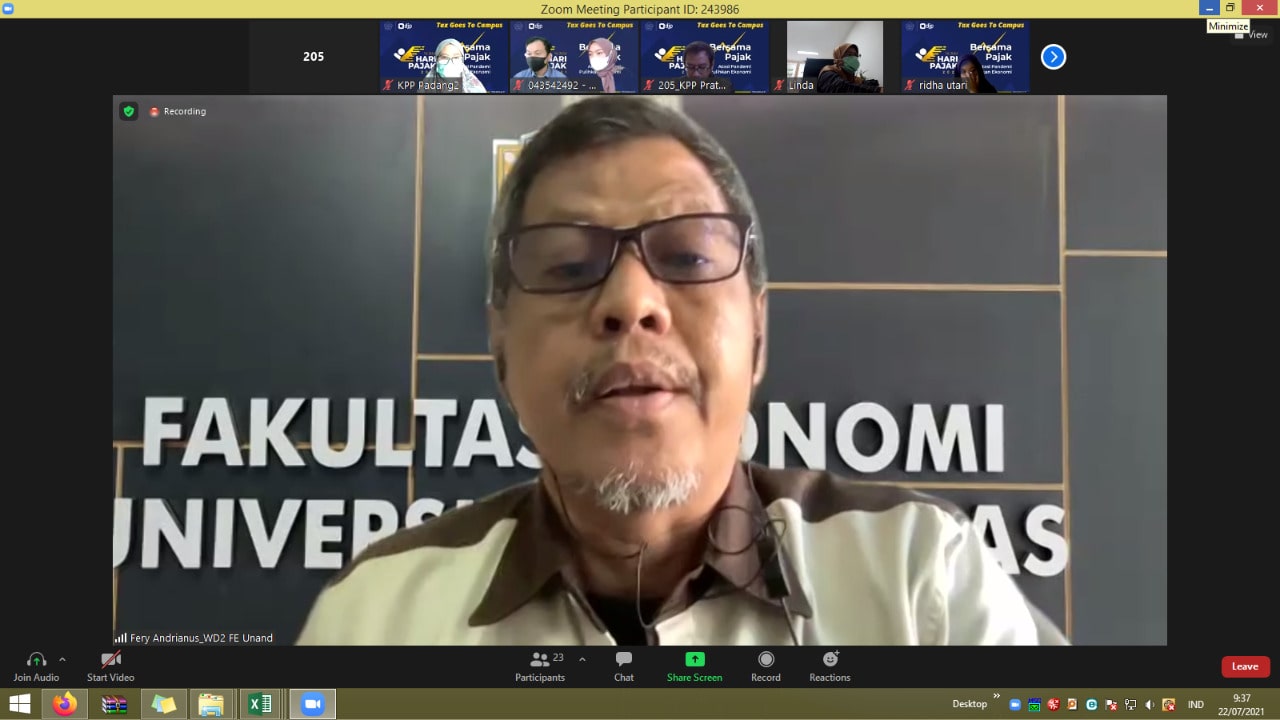 Tim Penyuluh Pajak Kantor Pelayanan Pajak (KPP) Pratama Padang Dua mengadakan kegiatan Tax Goes To Campus (TGTC) secara daring via Aplikasi Zoom Meetings bersama mahasiswa Fakultas Ekonomi Universitas Andalas (Kamis, 22/7).