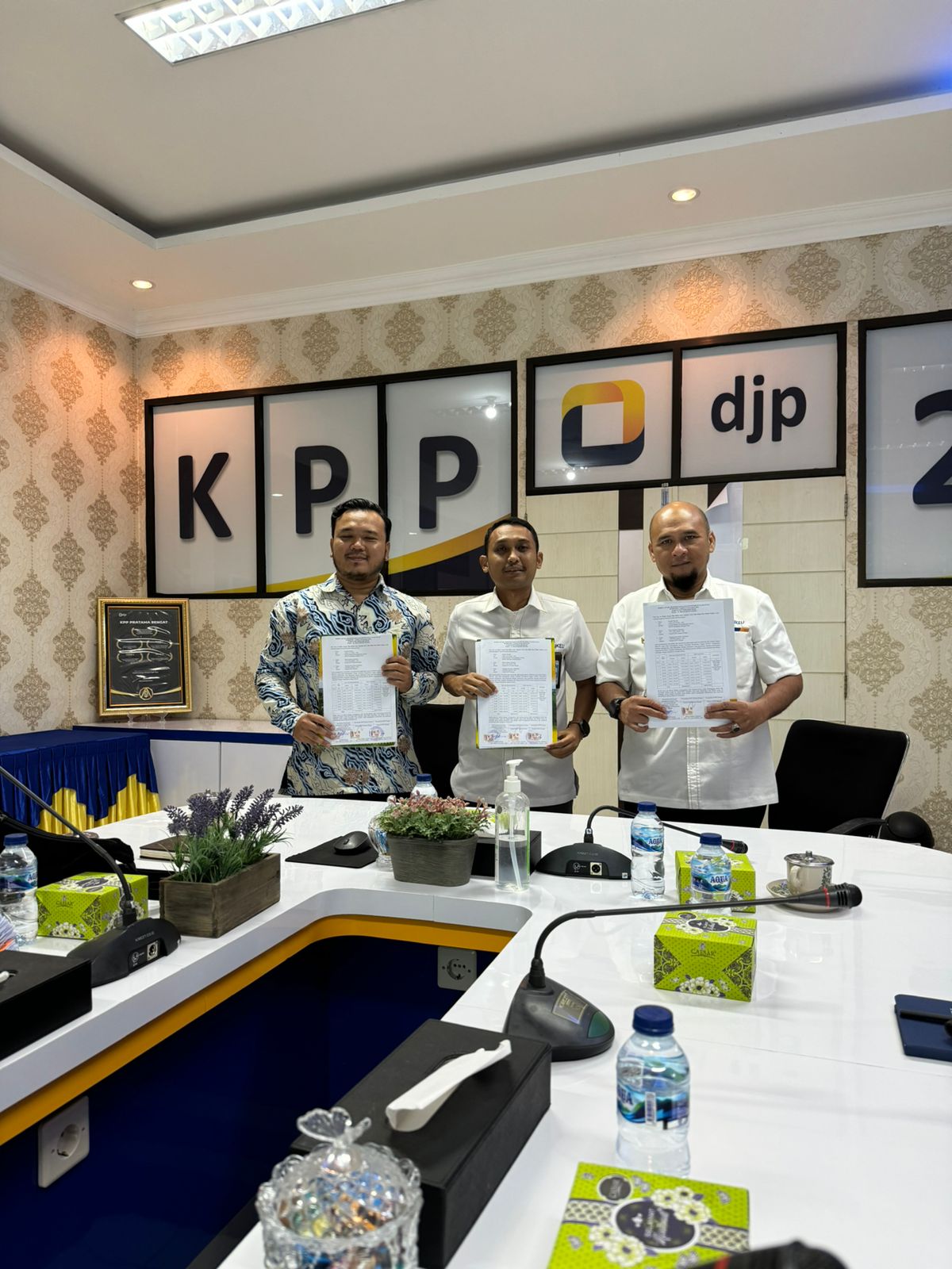 Kantor Pelayanan Pajak (KPP) Pratama Rengat melakukan penandatanganan Berita Acara Rekonsiliasi Pajak Semester I Tahun 2024 Kabupaten Indragiri Hilir di Ruang Rapat KPP Pratama Rengat (Senin, 26/8). Penandatanganan tersebut dilakukan oleh Kepala KPP Pratama Rengat Budi Anshary Nasution, Kepala Kantor Pelayanan Perbendaharaan Negara (KPPN) Rengat Nanang Heru Setyo Purdianto, serta Kepala Bidang Perbendaharaan Badan Keuangan dan Aset Daerah (BKAD) Indragiri Hilir Hendra Rusady.