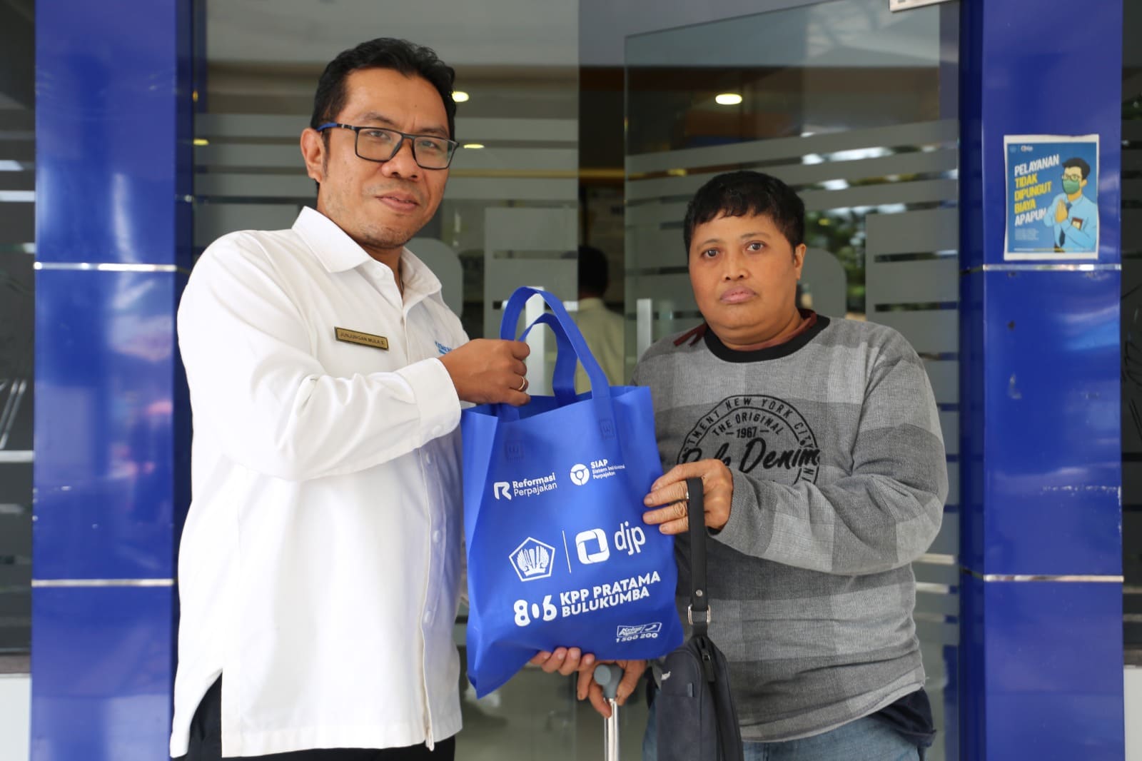 Melihat semangat yang ditunjukkan Mas Daeng Intang, Kepala Seksi Pelayanan Junjungan Mula Sangap memberikan souvenir sebagai wujud apresiasi KPP Pratama Bulukumba kepada wajib pajak yang gigih menjalankan kewajiban perpajakan di tengah keterbatasan yang dimiliki.