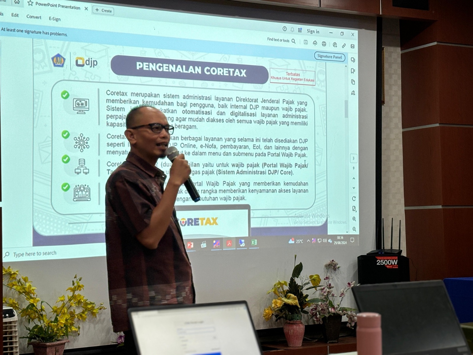 Kantor Pelayanan Pajak (KPP) Pratama Pekanbaru Tampan mengadakan kegiatan Edukasi Coretax bagi Wajib Pajak bertempat di aula KPP Pratama Pekanbaru Tampan (Kamis, 19/9). Kegiatan ini merupakan batch terakhir dari total sepuluh batch yang telah dilaksanakan sejak 29 Agustus 2024 yang lalu dengan mengundang 20 Wajib Pajak berbeda untuk setiap batch-nya sehingga total Wajib Pajak yang diundang dalam rangkaian kegiatan ini adalah sejumlah 200 Wajib Pajak.