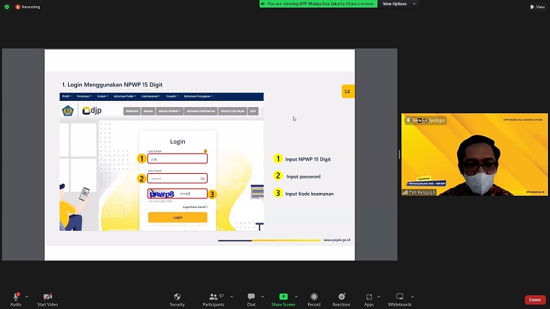 Kantor Pelayanan Pajak (KPP) Madya Dua Jakarta Utara mengadakan sosialisasi SPT Tahunan Orang Pribadi dan Implementasi Nomor Induk Kependudukan (NIK) sebagai Nomor Pokok Wajib Pajak (NPWP) secara daring melalui aplikasi Zoom Meeting di Jakarta (Jumat, 10/2). Sosialisasi dihadiri karyawan Wajib Pajak Badan pemberi kerja dari pukul 10.00 sampai 12.00 WIB.