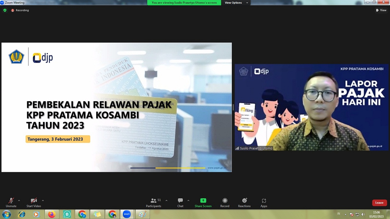 Kantor Pelayanan Pajak (KPP) Pratama Kosambi mengadakan webinar melalui aplikasi Zoom Meeting kepada mahasiswa Universitas Muhammadiyah Tangerang dan Universitas Muhammadiyah Jakarta di Kabupaten Tangerang, Banten (Jumat, 3/2). Webinar diselenggarakan dalam rangka memberikan pembekalan terkait asistensi pengisian dan pelaporan SPT Tahunan kepada para relawan pajak.