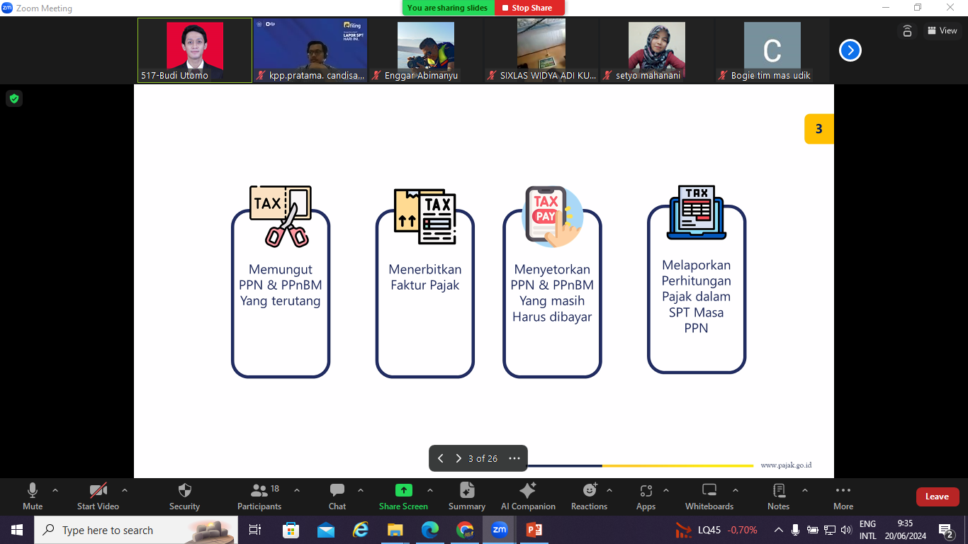 Kantor Pajak Pelayanan (KPP) Pratama Semarang Candisari menggelar kelas pajak daring khususnya bagi Wajib Pajak (WP) Pengusaha Kena Pajak (PKP), membahas kewajiban perpajakan PKP yang disampaikan langsung oleh penyuluh pajak di Zoom meeting KPP Pratama Semarang Candisari pukul 09.00 WIB hingga selesai (Kamis, 20/06).