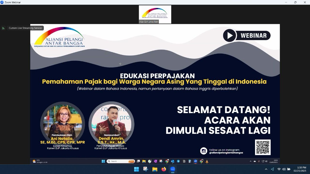 Webinar ini menghadirkan Ani Natalia, Kepala Bidang Penyuluhan, Pelayanan, dan Hubungan Masyarakat (P2Humas), bersama Dendi Amrin, Penyuluh Pajak Ahli Madya, serta Nia Schumacher, Ketua Aliansi Pelangi Antar Bangsa.