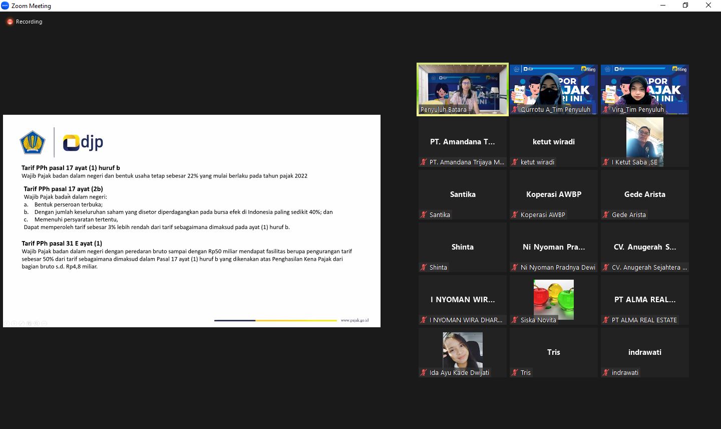 Kantor Pelayanan Pajak (KPP) Pratama Badung Utara menyelenggarakan penyuluhan kepada Wajib Pajak Badan terkait dengan Pajak Penghasilan (PPh) Badan tentang kewajiban Wajib Pajak Badan setelah tarif 0.5% (PP55/2022) berakhir. Kegiatan ini merupakan penyuluhan yang dilakukan oleh Tim Penyuluh KPP Pratama Badung Utara Dian Antalina yang dilaksanakan dengan menggunakan media Zoom Meeting di Ruang Podcast KPP Badung Utara (Jumat, 26/5).