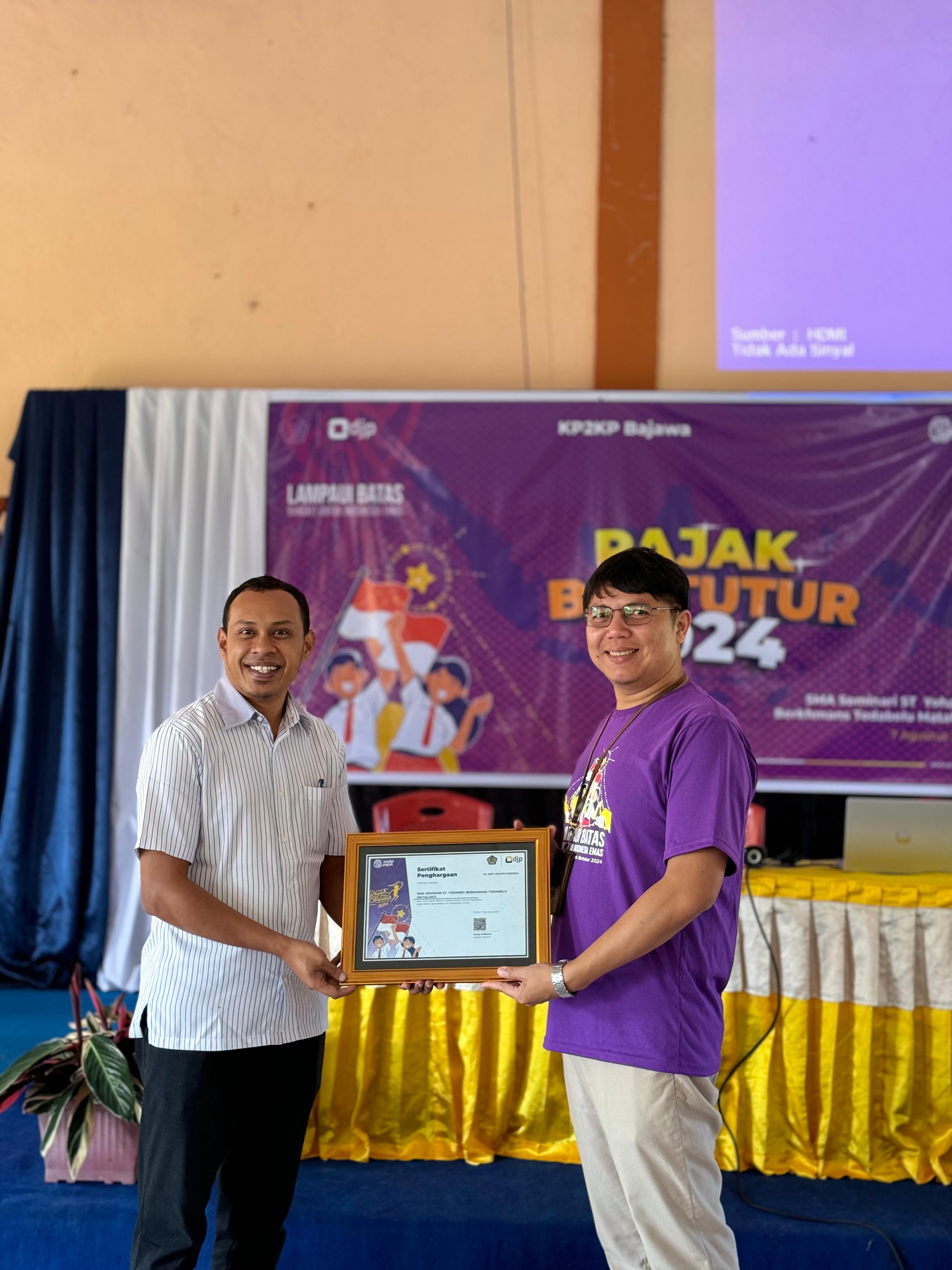 Kantor Pelayanan Penyuluhan dan Konsultasi Perpajakan (KP2KP Bajawa) menyelenggarakan kegiatan "Pajak Bertutur 2024" di SMA Seminari St. Yohanes Berkhmans Todabelu, Mataloko (Rabu, 7/8).