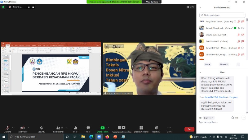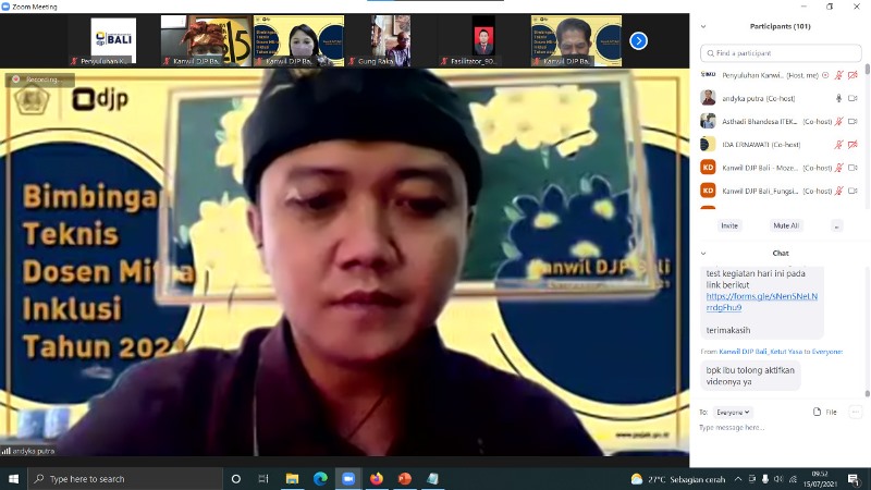 Kantor Wilayah Direktorat Jenderal Pajak Bali (Kanwil DJP Bali) mengadakan Bimbingan Teknis Dosen Mitra Inklusi Tahun 2021 melalu media zoom di Bali (Kamis, 15/7). Kegiatan ini dihadiri oleh 33 Perguruan Tinggi di Bali yang telah menjalin kerja sama terkait Inklusi Kesadaran Pajak.