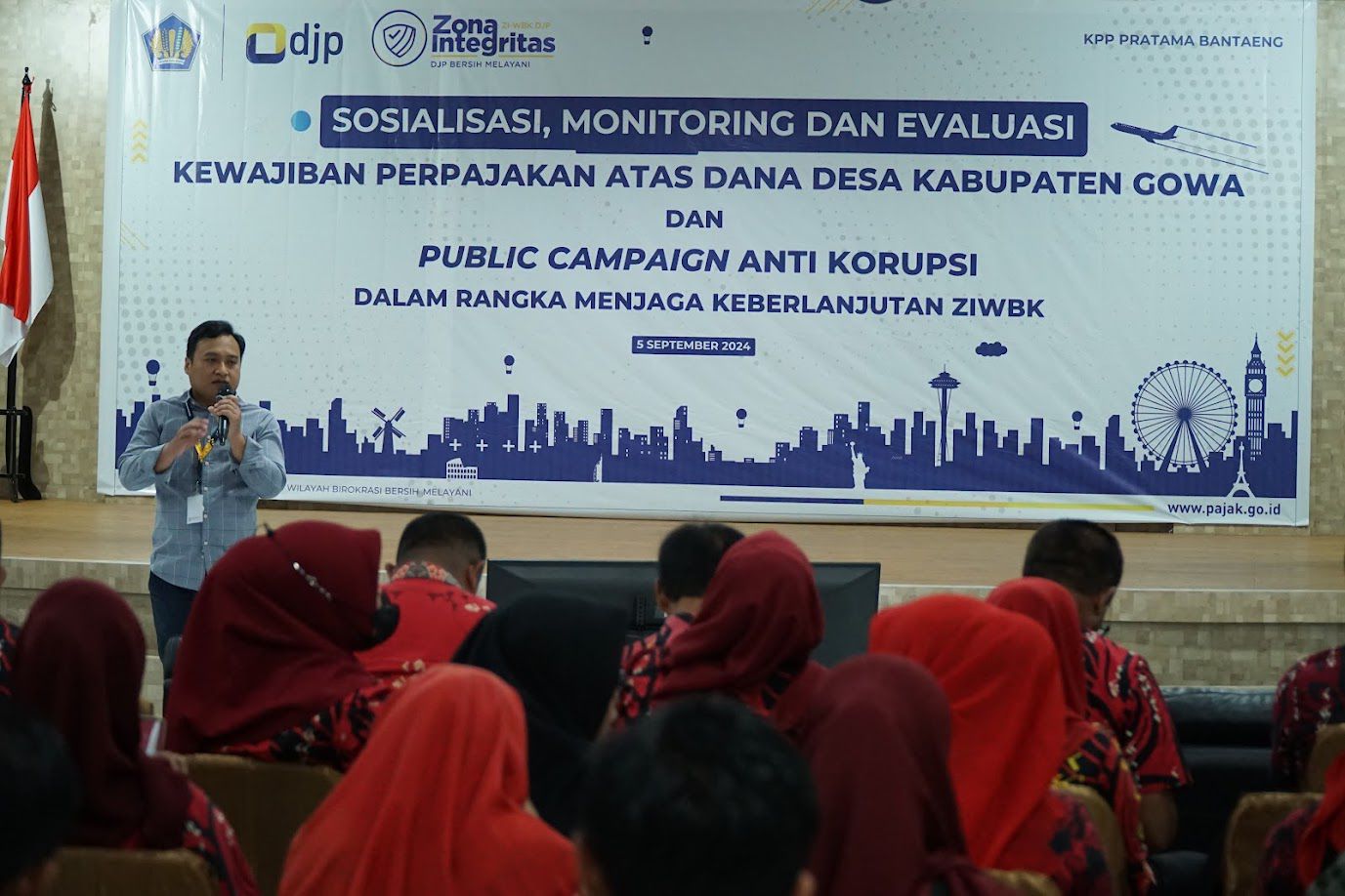 Kantor Pelayanan Pajak (KPP) Pratama Bantaeng menyelenggarakan kegiatan Monitoring dan Evaluasi (Monev) kewajiban perpajakan atas dana desa Kabupaten Gowa Tahun 2024 yang dirangkaikan dengan Public Campaign Antikorupsi dalam rangka menjaga keberlanjutan ZI-WBK di Aula Lantai 6 Gedung Keuangan Negara 2 Makassar (Kamis, 5/9). Acara ini dihadiri oleh berbagai pejabat terkait, termasuk perwakilan dari Inspektorat Daerah Kabupaten Gowa, Sekretaris Daerah Kabupaten Gowa, Dinas Pemberdayaan Masyarakat dan Desa Kabupaten Gowa, serta Badan Pengelolaan Keuangan Daerah Kabupaten Gowa. Adapun Kepala Seksi Pengawasan IV KPP Pratama Bantaeng dan Kepala Kantor Pelayanan, Penyuluhan, dan Konsultasi Perpajakan (KP2KP) Sungguminasa turut hadir sebagai representasi KPP Pratama Bantaeng.
