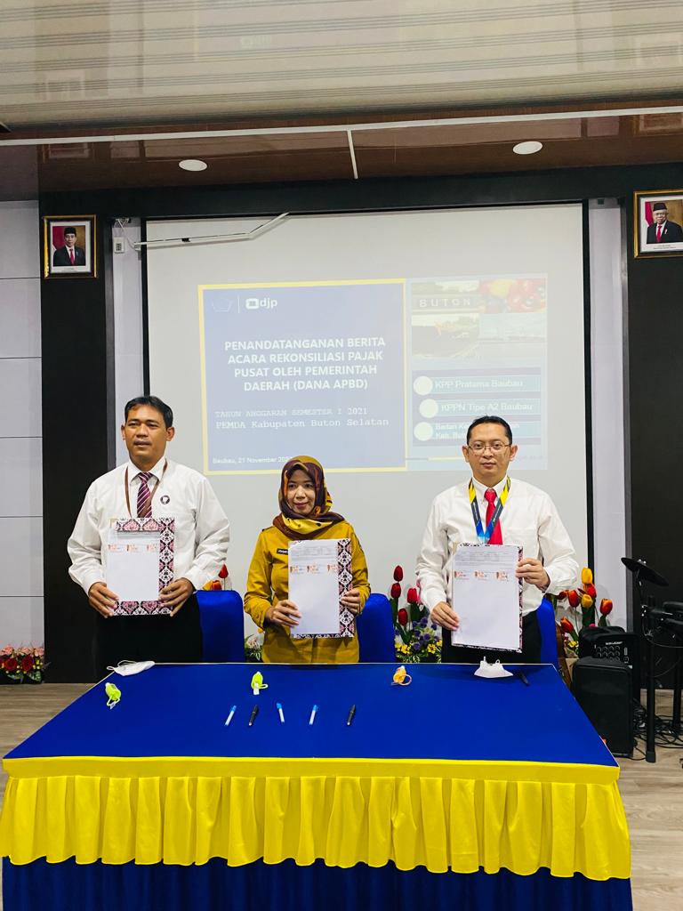Penandatanganan berita acara rekonsiliasi dilakukan oleh Tangguh Dewantara selaku Kepala KPP Pratama Baubau, Hariyanto selaku Kepala KPPN Baubau, dan Plt. Kepala BKAD Kabupaten Buton Selatan. Berita acara rekonsiliasi yang telah ditandatangani dijadikan sebagai laporan kinerja pemerintah daerah dalam mendukung optimalisasi penerimaan negara dan pemulihan ekonomi nasional.