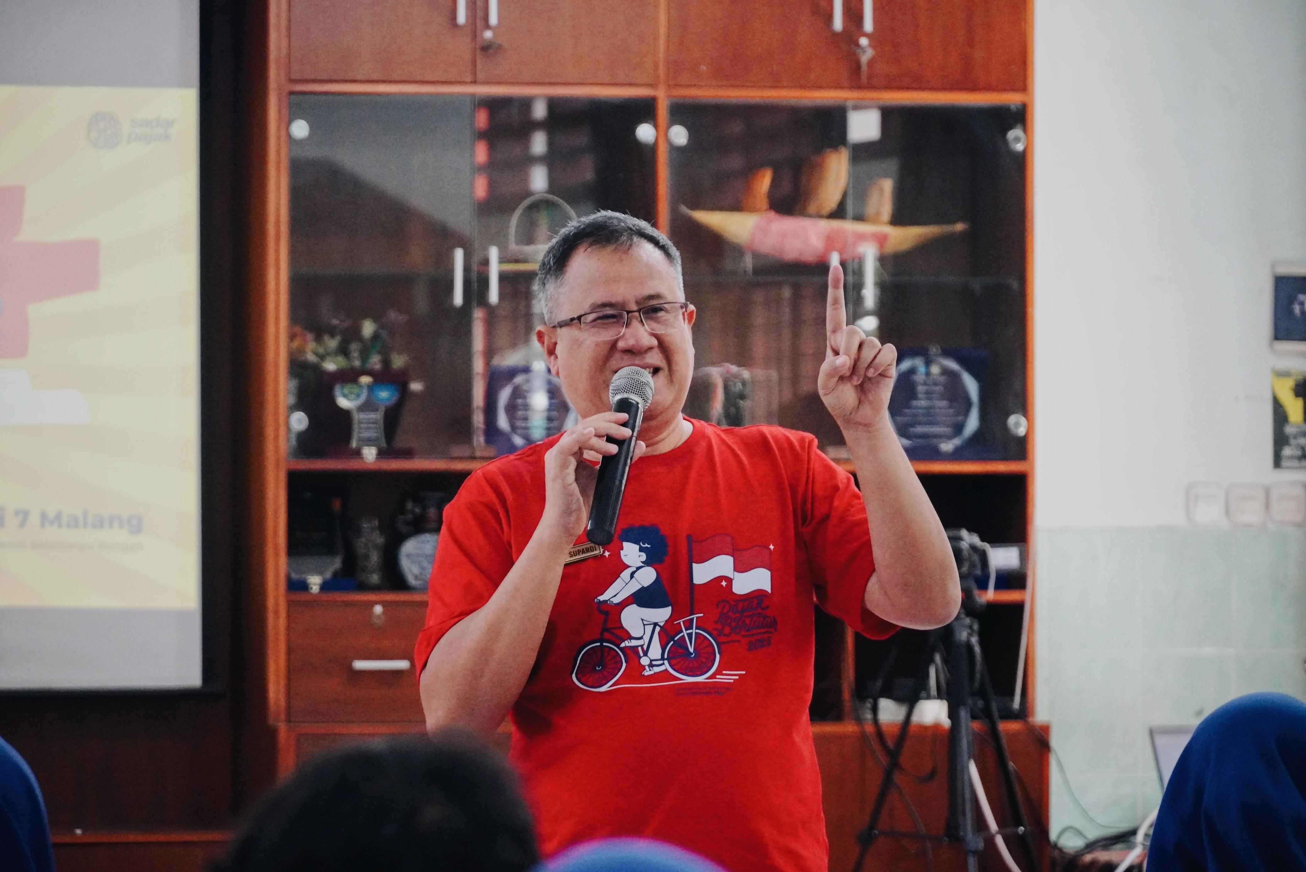 Di hadapan siswa SMPN 7 Malang, Kepala Kanwil DJP Jawa Timur III, Untung Supardi, mendorong siswa untuk menyampaikan kembali pesan penting ini ke keluarga dan lingkungan sekitar.
