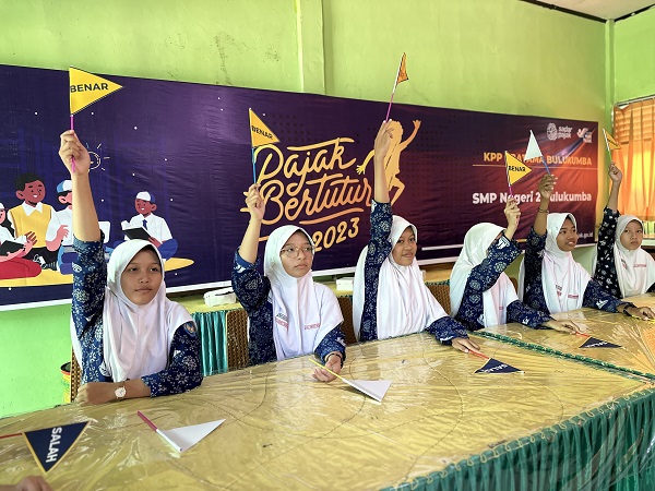 Kantor Pelayanan Pajak (KPP) Pratama Bulukumba menggelar kegiatan Pajak Bertutur (Patur) 2023 bersama Sekolah Menengah Pertama Negeri (SMPN) 2 Bulukumba (Selasa, 27/7). Diikuti oleh 42 siswa-siswi dan 5 perwakilan guru serta pembina OSIS SMPN 2 Bulukumba, kegiatan Patur 2023 ini berlangsung di Ruang Laboratorian SMPN 2 Bulukumba.