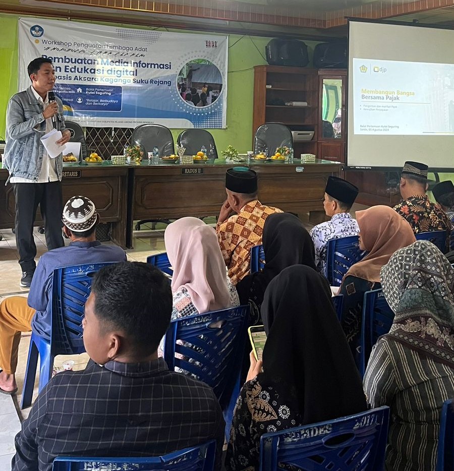 Kantor Pelayanan Pajak (KPP) Pratama Curup memberikan edukasi perpajakan di acara Workshop Penguatan Lembaga Adat Suku Rejang di Balai Pertemuan Kutei Seguring, Kantor Desa Kutei Seguring, Rejang Lebong (Senin, 5/8). Acara ini diprakarsai oleh Aliansi Masyarakat Adat Nusantara (AMAN) Kabupaten Rejang Lebong.