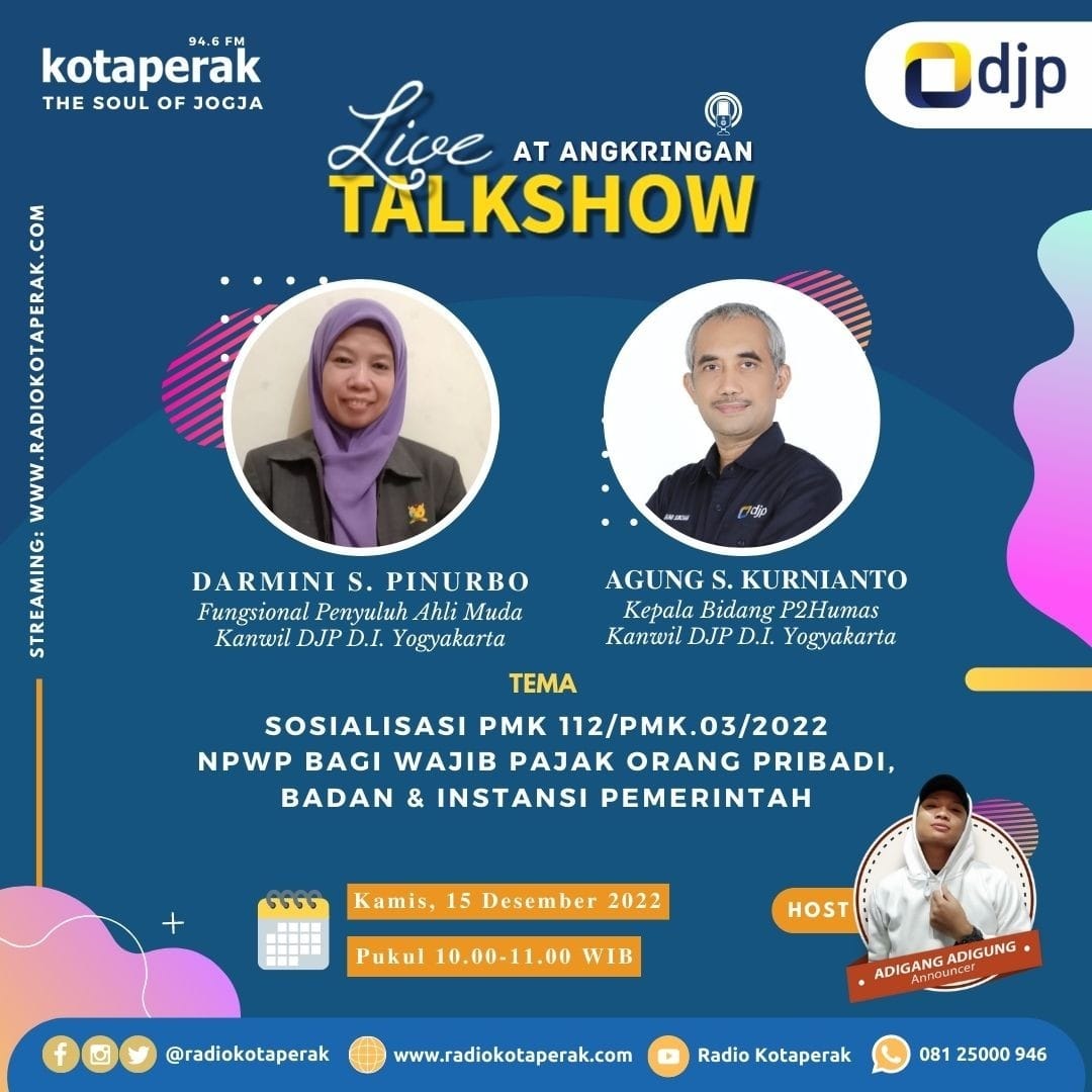 Kantor Wilayah Direktorat Jenderal Pajak Daerah Istimewa Yogyakarta (Kanwil DJP DIY) mengadakan Talkshow dengan tema PMK-112/PMK.03/2022 tentang Nomor Pokok Wajib Pajak (NPWP) Orang Pribadi, Wajib Pajak Badan, dan Wajib Pajak Instansi Pemerintah di Radio Kota Perak (Kamis, 15/12).