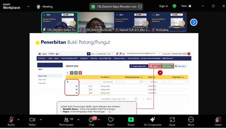 Selain Eko Susanto, Penyuluh Pajak Darmini Setyo Pinurbo dan Firstiyana Amin Ningno juga menyampaikan materi. Darmini menjelaskan tentang menu e-Bupot dan Surat Pemberitahuan (SPT), dimulai dari alur pembuatan bukti potong baik bukti potong unifikasi maupun bukti potong PPh pasal 21 sampai dengan pelaporan SPT Masa.