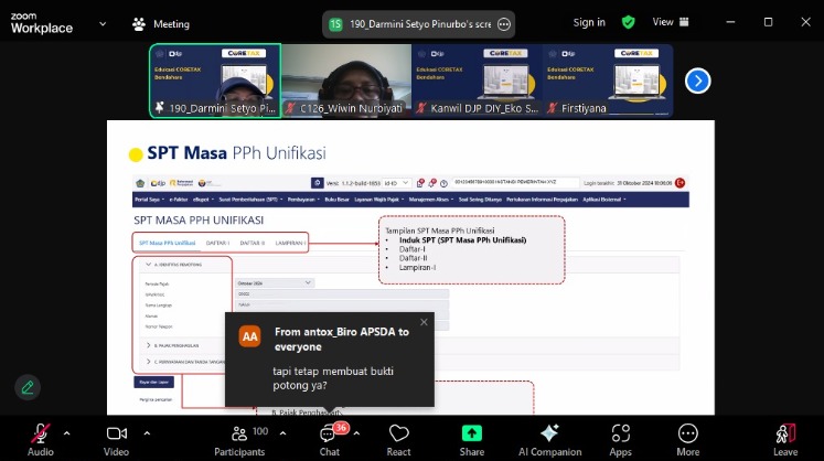 Kantor Wilayah Direktorat Jenderal Pajak Daerah Istimewa Yogyakarta (Kanwil DJP DIY) menyelenggarakan kegiatan edukasi Coretax kepada para bendahara di lingkungan Pemerintah Daerah (Pemda) DIY (Rabu, 11/12). Kegiatan edukasi dilaksanakan secara daring dan diikuti oleh 100 peserta.