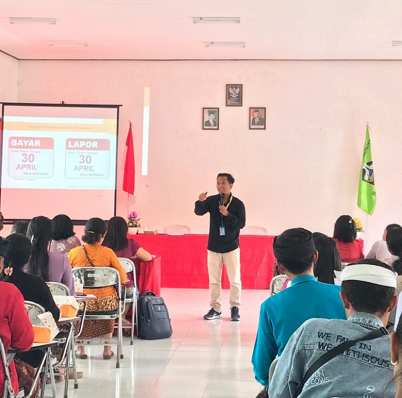 Tim penyuluh Kantor Pelayanan Pajak (KPP) Pratama Gianyar bersama dengan Dinas Pemberdayaan Masyarakat dan Desa Kabupaten Bangli menyelenggarakan sosialisasi perpajakan kepada Badan Usaha Milik Desa (Bumdes) di wilayah Kabupaten Bangli (Kamis, 27/4). Acara yang dilaksanakan di Sanggar Kegiatan Belajar (SKB) Kayuambua, Bangli ini dihadiri oleh 33 perwakilan Bumdes yang berada di wilayah Kabupaten Bangli.