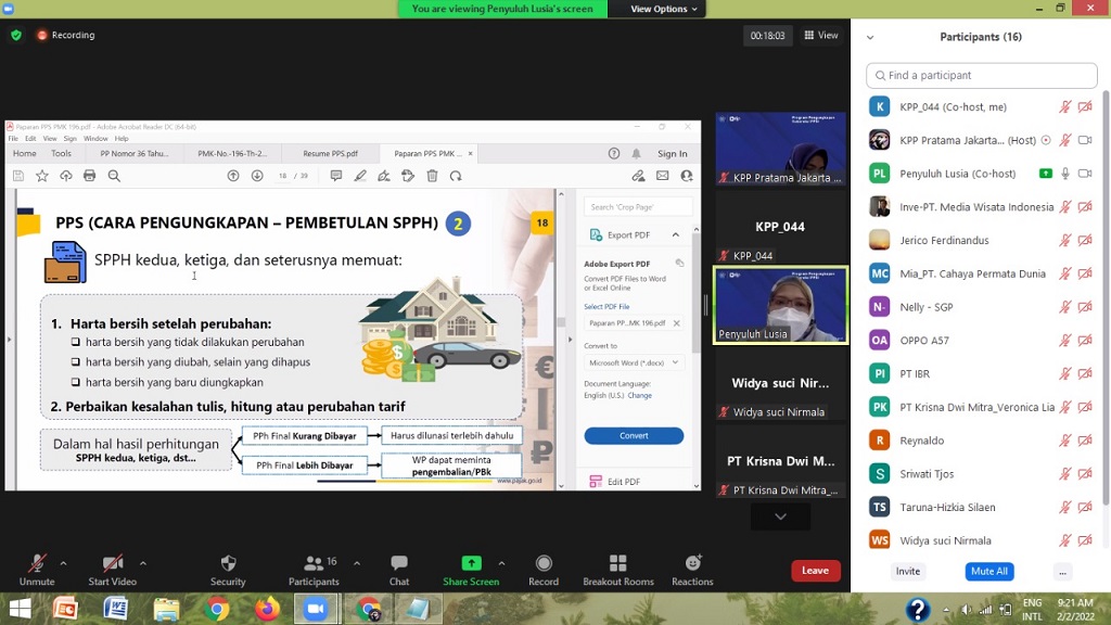 Kantor Pelayanan Pajak (KPP) Pratama Jakarta Pademangan mengadakan kelas pajak Program Pengungkapan Sukarela (PPS) (Rabu,2/2). Kegiatan diselenggarakan melalui Zoom Meeting di ruang penyuluh KPP Pratama Jakarta Pademangan, diikuti 16 Wajib Pajak Orang Pribadi dan Wajib Pajak Badan.