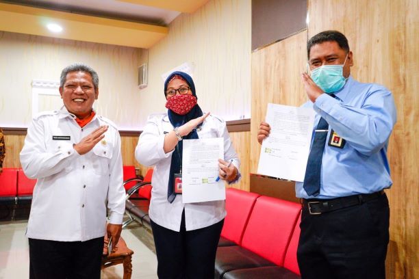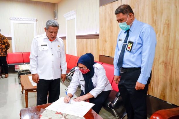 Kepala Kanwil DJP Kalimantan Barat Ahmad Djamhari melakukan penandatangan Perjanjian Kerja Sama (PKS) dengan Kepala Dinas Penanaman Modal dan Pelayanan Terpadu Satu Pintu (DPMPTSP) Maria Agustina di Aula Bupati Kubu Raya (Rabu, 29/7).
