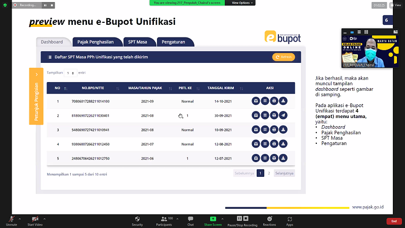 Kelas pajak yang diikuti oleh lebih dari 100 wajib pajak ini dimulai dari pukul 10.00 sampai 12.00 WIB dan diisi oleh Penyuluh Pajak KPP Madya Batam Juliana, Ismail, dan Chairul Budi Prabowo. Selama sesi kelas pajak, wajib pajak sangat antusias dan aktif bertanya mengenai e-Bupot Unifikasi ini.