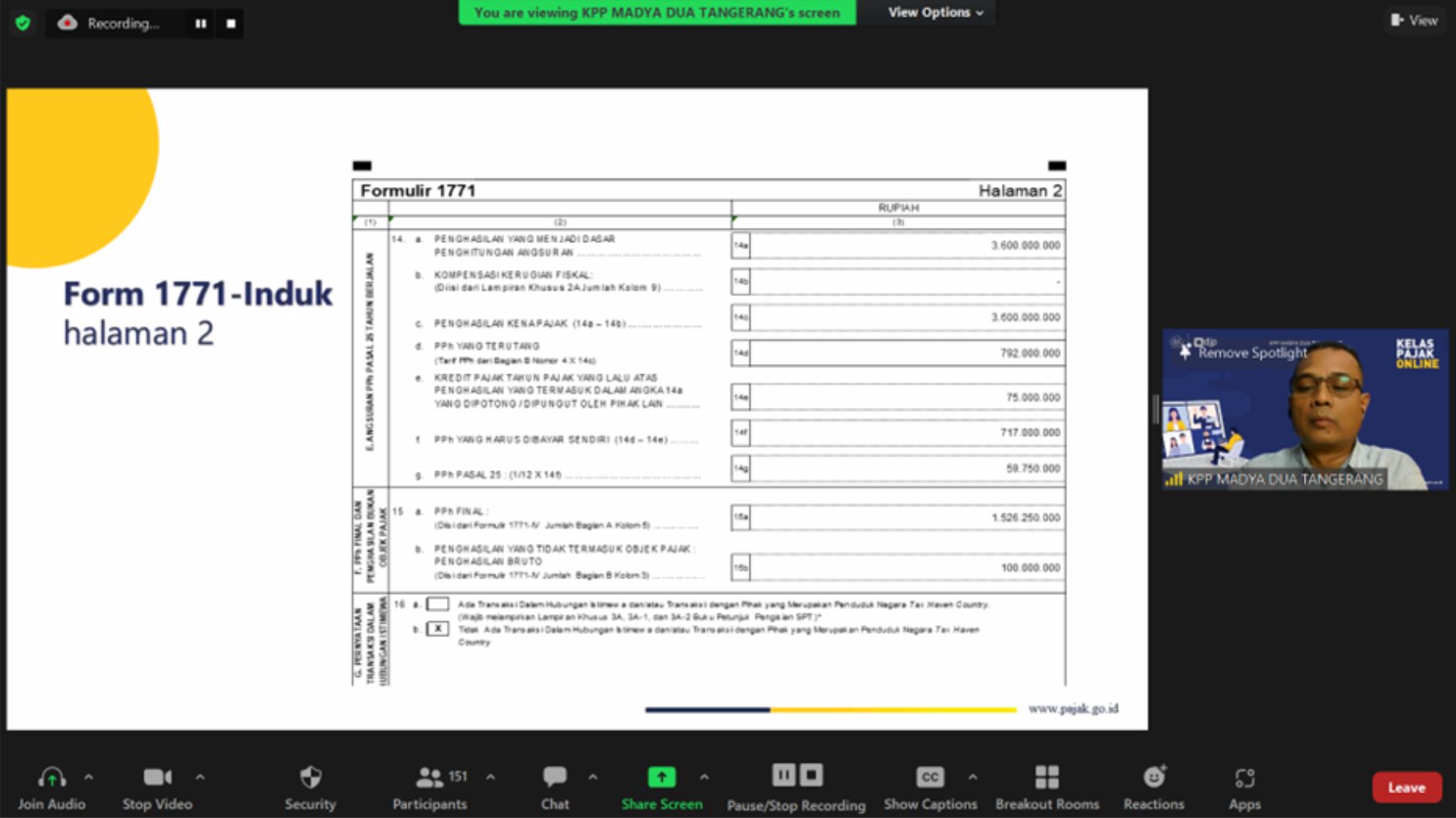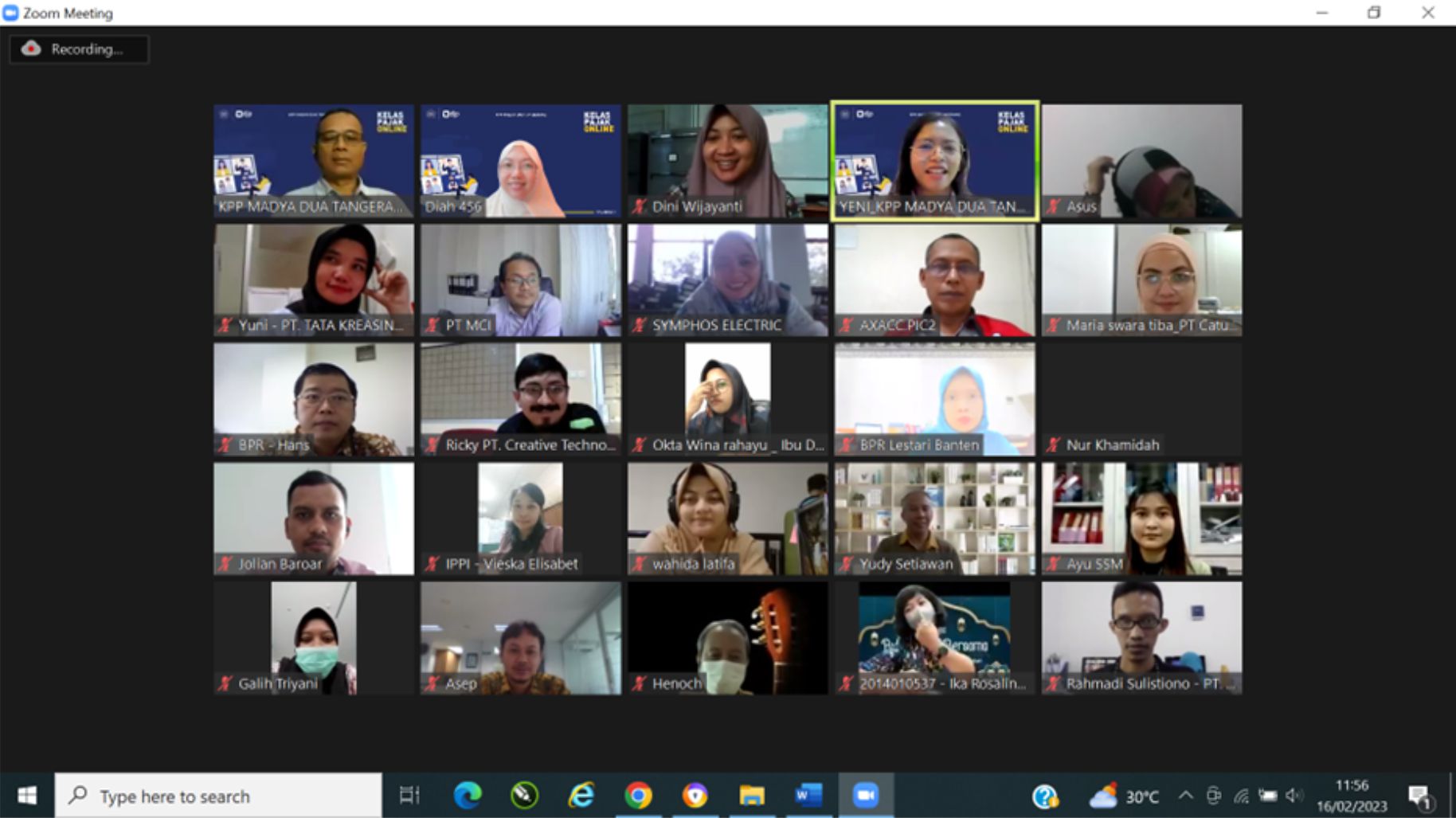 Kantor Pelayanan Pajak (KPP) Madya Dua Tangerang mengadakan kelas pajak secara daring dengan tema tata cara pelaporan SPT Tahunan Badan langsung dari KPP Madya Dua Tangerang, Kabupaten Tangerang (Kamis, 16/2).