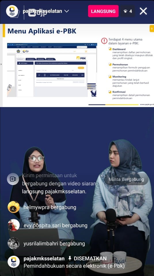 Tim Penyuluh Pajak Kantor Pelayanan Pajak (KPP) Pratama Makassar Selatan melaksanakan Live Instagram di ruang khusus live dan podcast KPP Pratama Makassar Selatan (Rabu, 14/12). Mengusung tema e-Pbk, Tim Penyuluh KPP Pratama Makassar Selatan beri edukasi kepada penonton mengenai aplikasi pemindahbukuan.