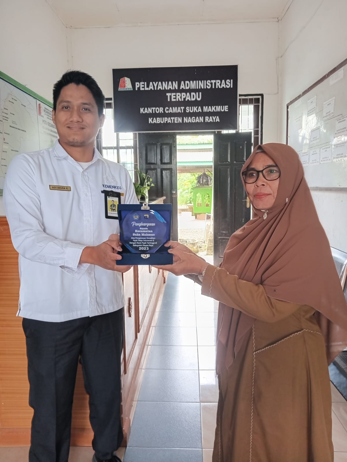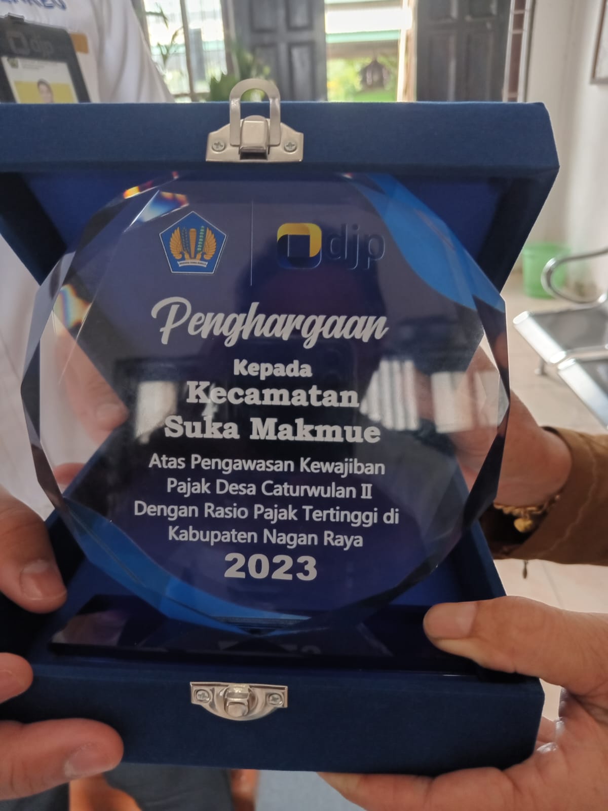 Kantor Pelayanan Pajak (KPP) Pratama Meulaboh dan Kantor Pelayanan, Penyuluhan, dan Konsultasi Perpajakan (KP2KP) Suka Makmur memberikan penghargaan kepada Kecamatan Suka Makmue atas Tax Effective Rate (TER) tertinggi se-Kabupaten Nagan Raya (Senin, 18/9).