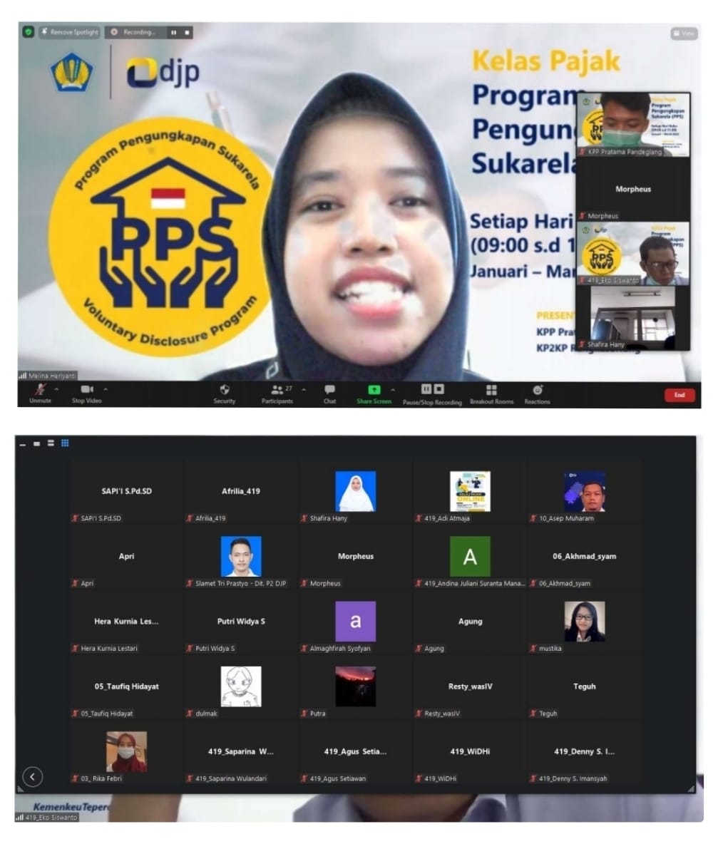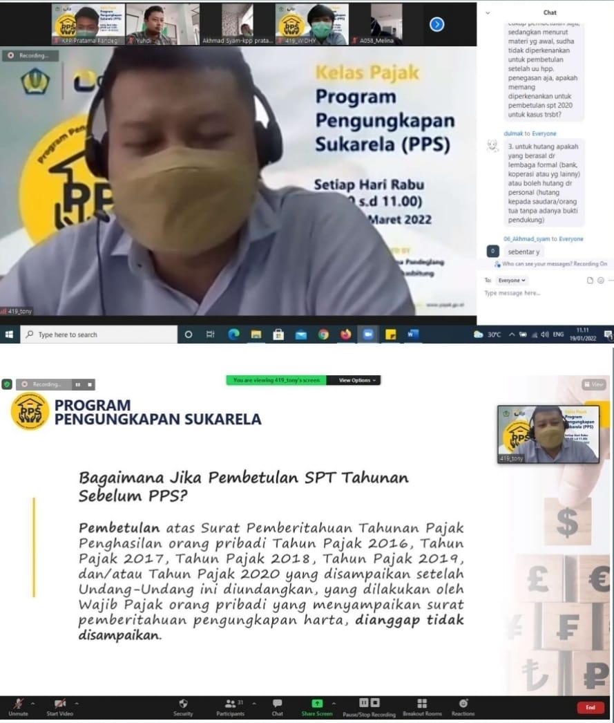 Tim Penyuluh Pajak Kantor Pelayanan Pajak (KPP) Pratama Pandeglang kembali mengajak wajib pajak dalam kelas pajak onilne agar dapat memanfaatkan Program Pengungkapan Sukarela (PPS) untuk mengungkapkan hartanya yang belum dilaporkan dalam SPT Tahunan yang dilaksanakan dari ruang studio KPP Pratama Pandegkang, Kabupaten Pandeglang (Rabu, 26/1).