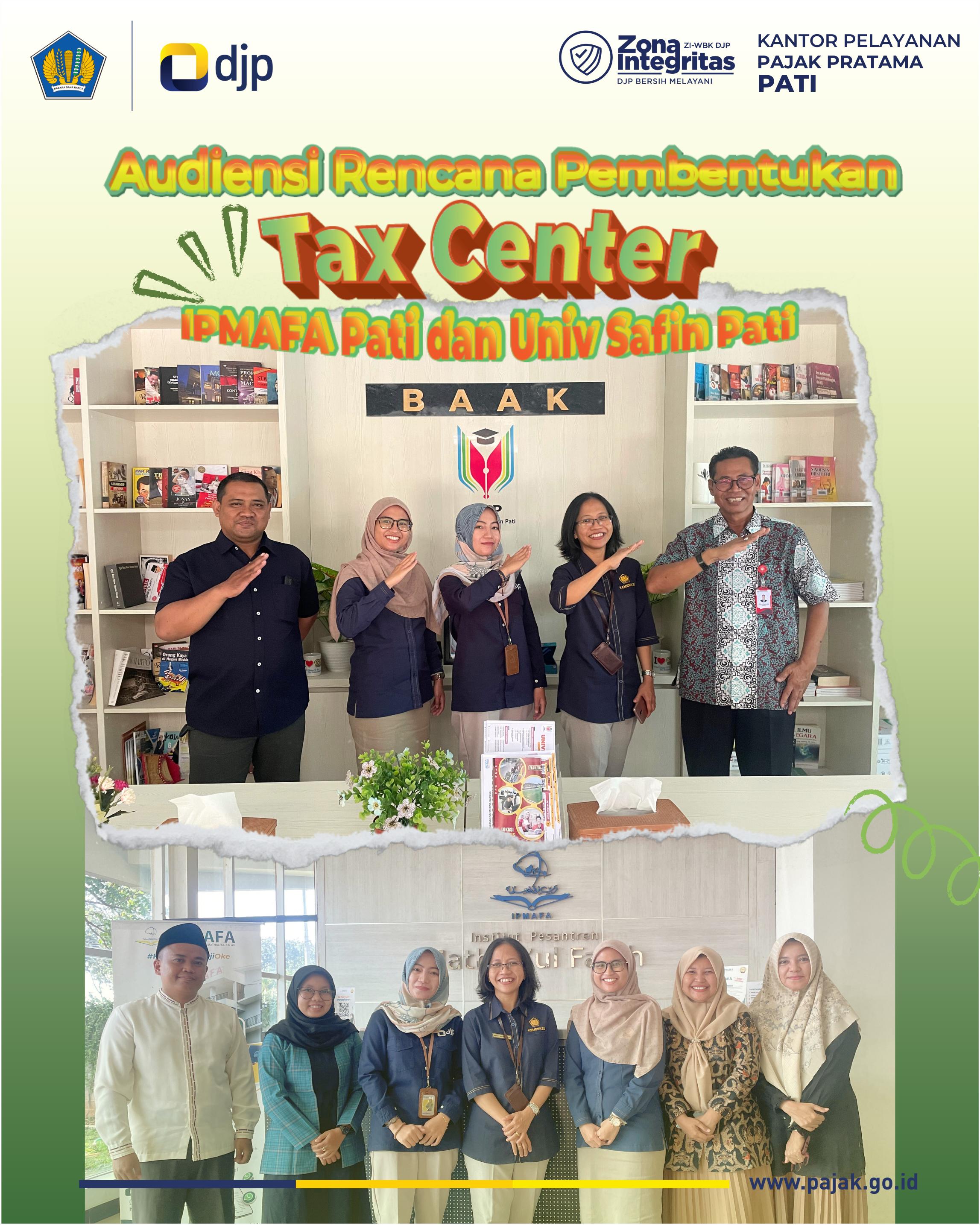 Kantor Pelayanan Pajak (KPP) Pratama Pati menggandeng Universitas Safin dan Institut Pesantren Mathaliul Falah Pati (IPMAFA Pati) untuk penjajakan program Tax Center, yaitu kegiatan yang merupakan kolaborasi Direktorat Jenderal Pajak (DJP) dengan Perguruan Tinggi untuk membentuk wadah dalam penyelenggaraan kegiatan pengkajian, penelitian, pelatihan dan soisalisasi perpajakan (Rabu, 5/6).