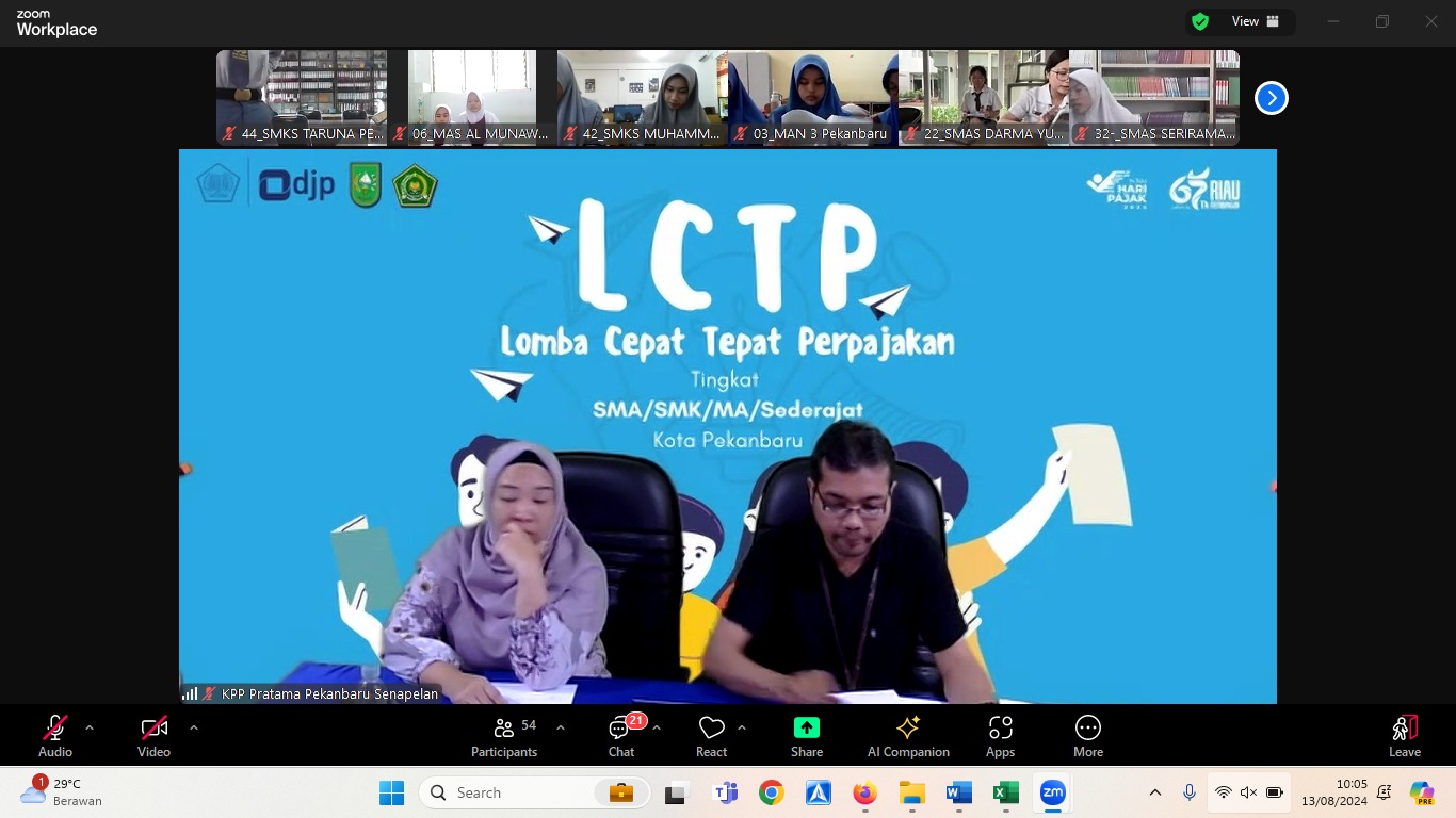 LCTP merupakan ajang perlombaan yang diadakan oleh Kantor Wilayah Direktorat Jenderal Pajak Riau (Kanwil DJP Riau) bagi sekolah tingkat SMA/MA/SMK sederajat di Provinsi Riau di Bulan Agustus 2024 secara daring. Kegiatan ini merupakan sebuah upaya pengenalan pajak sedari dini kepada para pelajar.