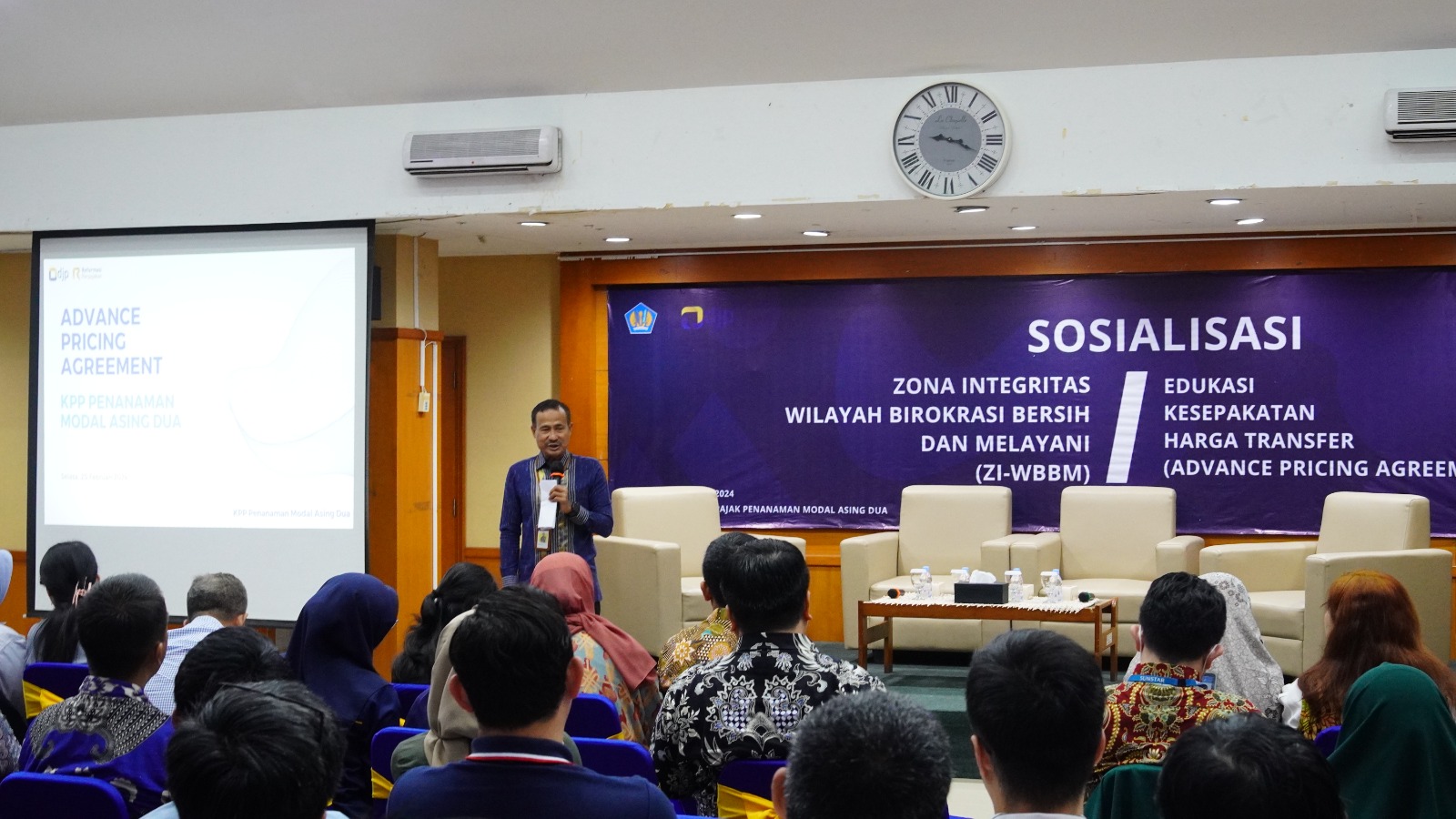 Kantor Pelayanan Pajak (KPP) Penanaman Modal Asing Dua (PMA Dua) menyelenggarakan Kegiatan Edukasi Kesepakatan Harga Transfer (Advance Pricing Agreement/APA) dan Sosialisasi Zona Integritas Wilayah Birokrasi Bersih dan Melayani (ZI-WBBM) kepada Wajib Pajak di Aula KPP Penanaman Modal Asing Dua, Kalibata, Jakarta Selatan (Selasa, 20/2).