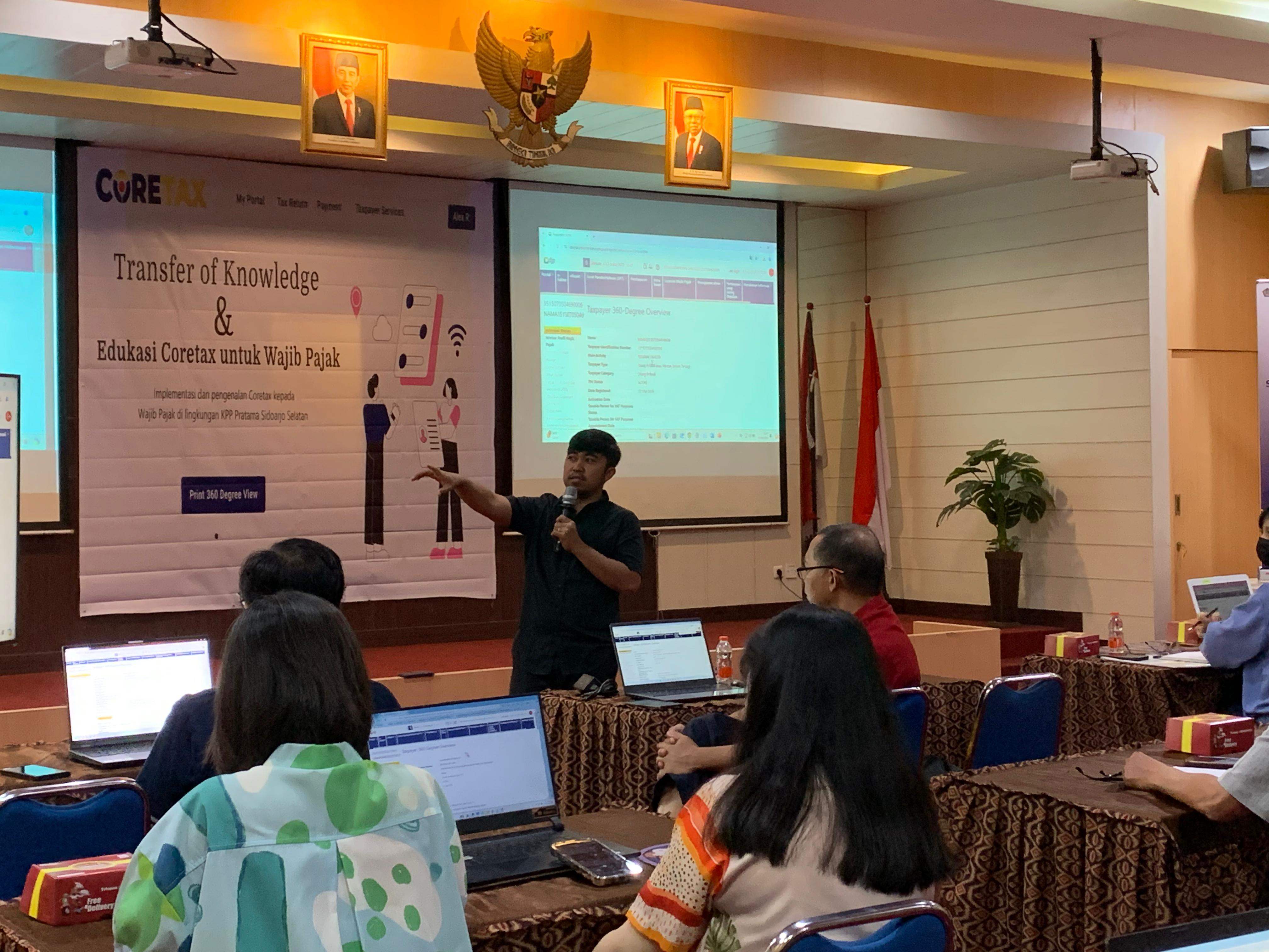 Kemudian kegiatan dilanjutkan dengan sesi edukasi oleh para penyuluh pajak dari KPP Pratama Sidoarjo Selatan. Para peserta diperkenalkan dengan aplikasi, fitur, dan proses bisnis apa saja yang berkaitan dengan Coretax. Penyuluh memaparkan beberapa hal antara lain terkait penjelasan umum yaitu menu profil, update data, kemudian dilanjutkan praktek bersama e-faktur, pembuatan e-Bupot, pelaporan SPT Tahunan Orang Pribadi serta SPT Tahunan Badan dengan asistensi Tim Edukasi Coretax KPP Pratama Sidoarjo Selatan.