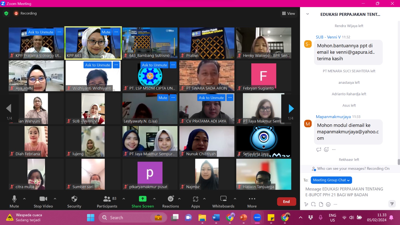 Kantor Pelayanan Pajak (KPP) Pratama Sidoarjo Utara mengadakan sosialisasi Peraturan Menteri Keuangan Nomor 168 Tahun 2023 (PMK 168/2023) terkait E-Bupot PPh Pasal 21/26 bagi wajib pajak badan secara daring melalui media aplikasi Zoom Meeting di Sidoarjo, Jawa Timur (Senin, 5/2). Sosialisasi aturan perpajakan baru ini dimulai pukul 09.00 WIB hingga pukul 11.00 WIB. Kegiatan ini diikuti oleh sekitar 100 wajib pajak di wilayah Kecamatan Buduran, Gedangan, Sedati, dan Waru .
