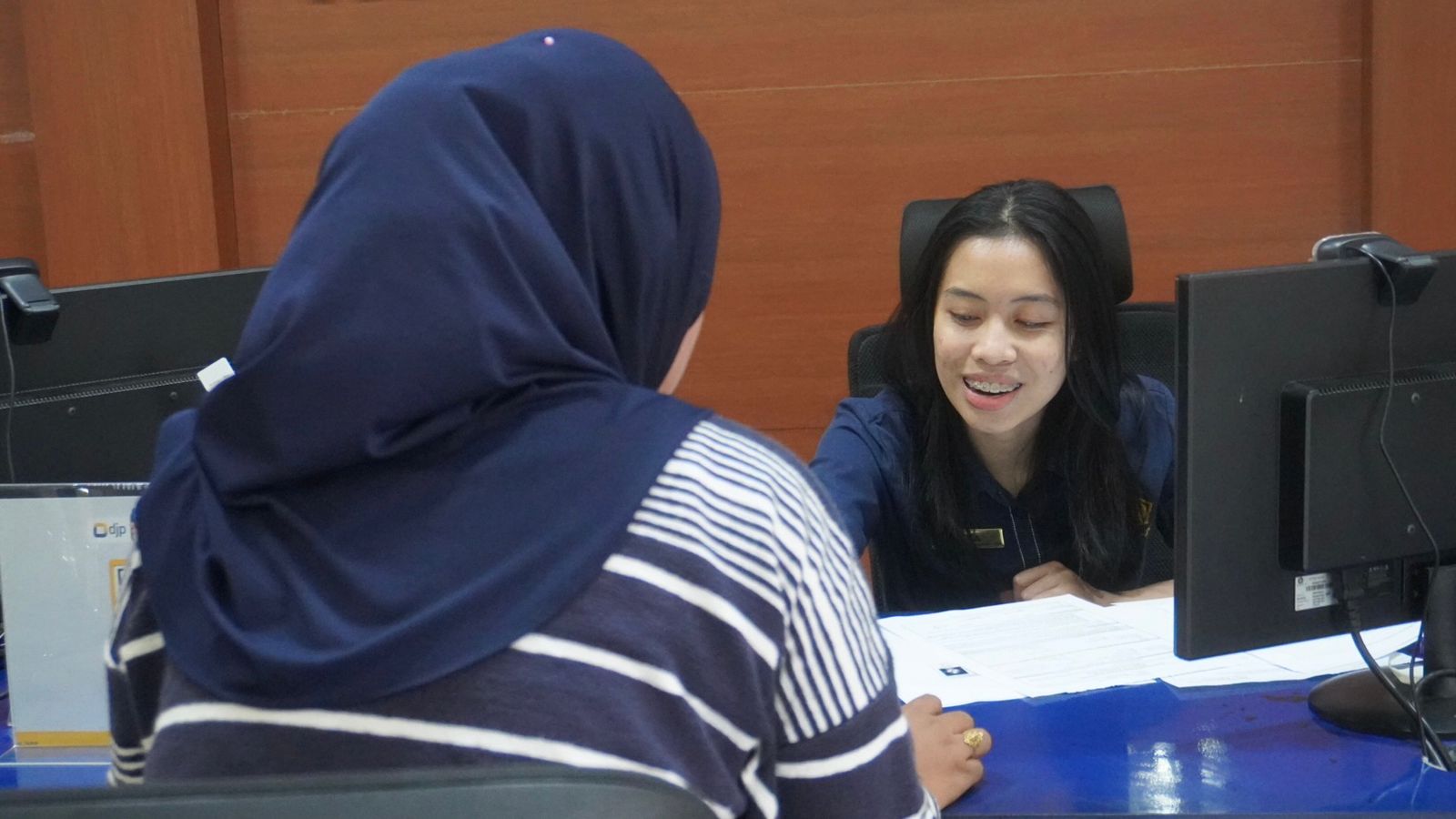 Citra, seorang bendahara pengeluaran daerah, mengutarakan tujuan kedatangannya kepada petugas TPT Reiza. “Saya mau konsultasi soal pajak yang dipotong atas belanja jasa, misalnya jasa katering. Tarifnya berapa ya Bu?” tanya Citra.