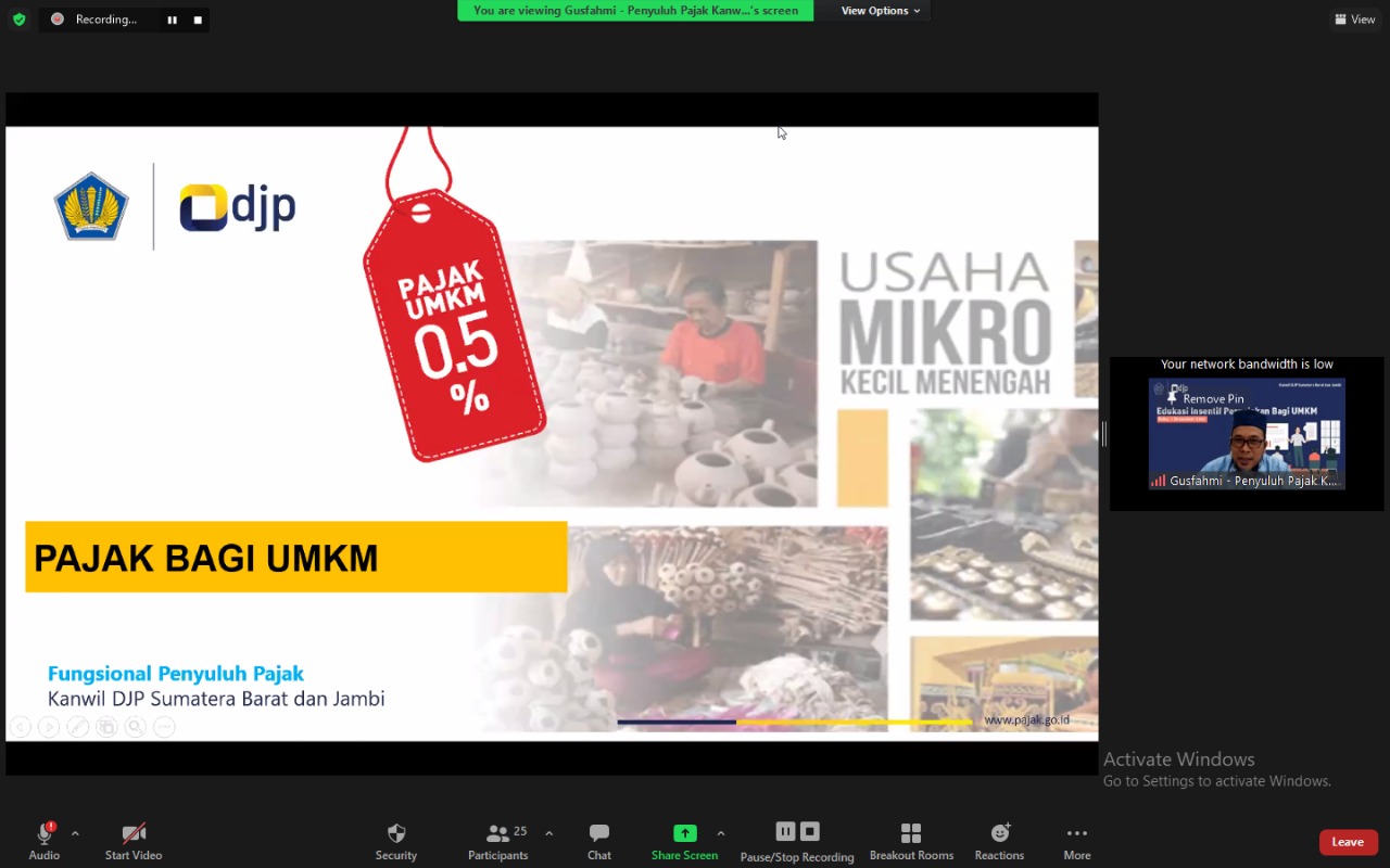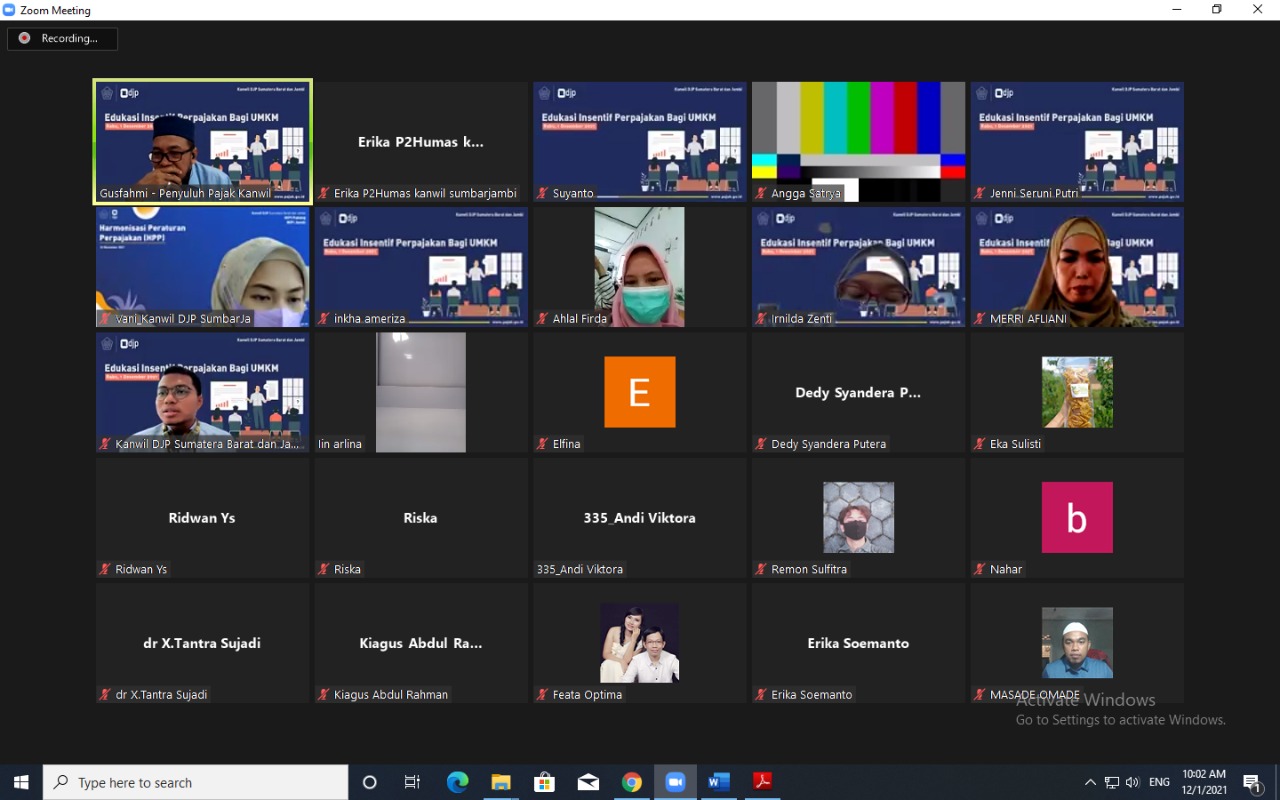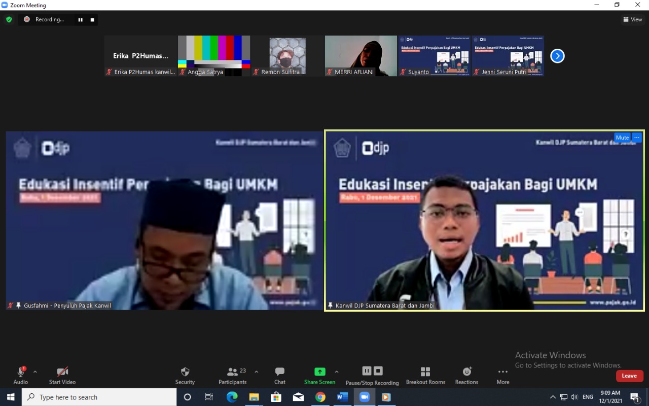 Sebagai upaya nyata Direktorat Jenderal Pajak (DJP) dalam mengatasi dampak krisis akibat pandemi Covid-19, Kantor Wilayah (Kanwil) DJP Sumatera Barat dan Jambi kembali mengadakan Edukasi Insentif Perpajakan Bagi Usaha Mikro Kecil dan Menengah (UMKM) secara daring dari gedung DJP Sumatera Barat dan Jambi (Rabu, 1/21).