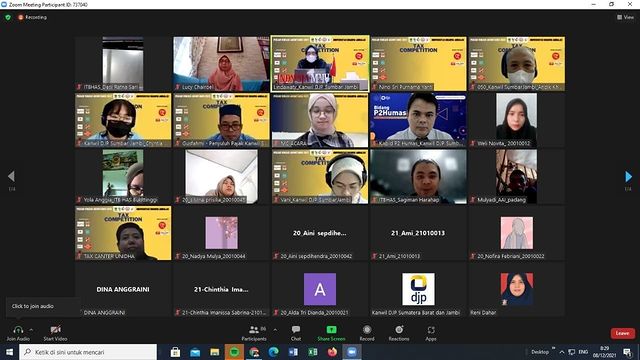 Kantor Wilayah Direktorat Jenderal Pajak (Kanwil DJP) Sumatera Barat dan Jambi menghadiri acara Tax Competition Pekan Vokasi Akuntansi 2021 yang diadakan oleh Tax Center Universitas Darma Andalas secara daring melalui Aplikasi Zoom Cloud Meeting di Padang, Sumatera Barat (Rabu, 8/12).