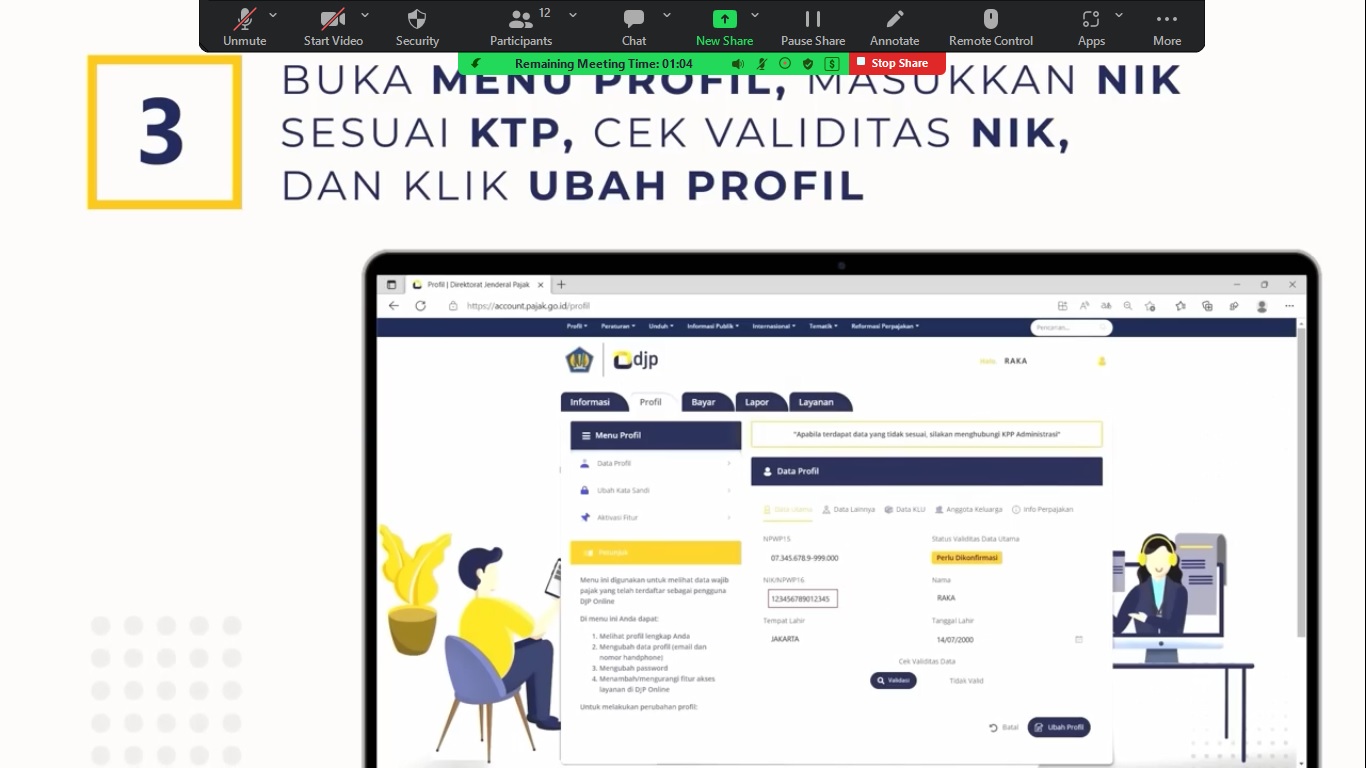 Selanjutnya, penyuluh memberikan informasi mengenai tutorial pemutakhiran data NIK secara mandiri melalui akun DJP Online. Acara diakhiri dengan pemberian kuesioner kepada para partisipan terkait materi yang telah diberikan.