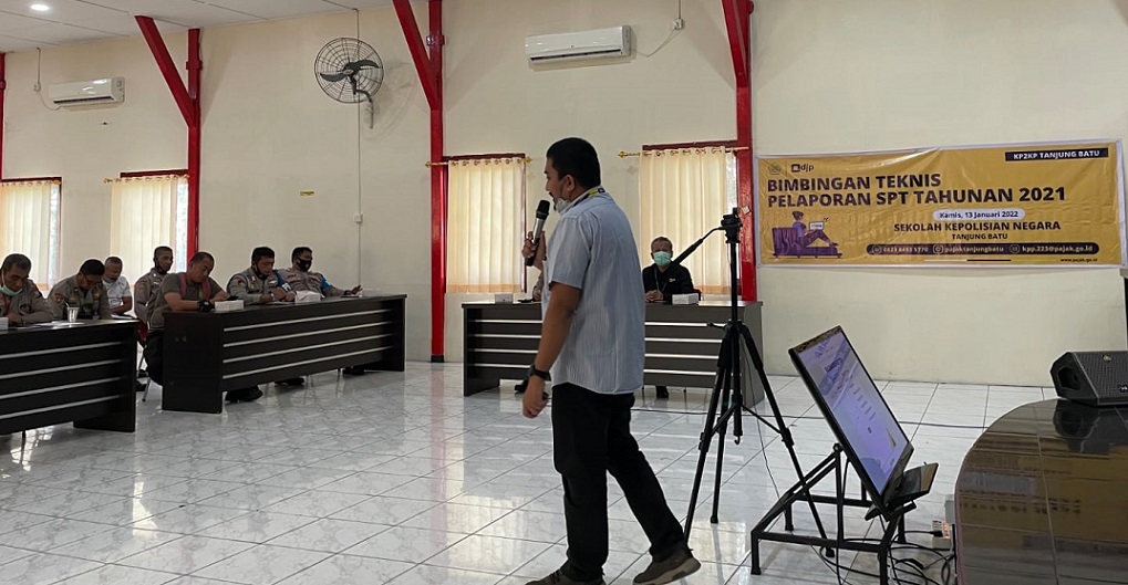 Kantor Pelayanan Penyuluhan dan Konsulatasi Perpajakan (KP2KP) Tanjung Batu bekerja sama dengan Kantor Pelayanan Pajak (KPP) Tanjung Balai Karimun menyelenggarakan bimbingan teknis (bimtek) penyampaian Surat Pemberitahuan (SPT) Tahunan Pajak Penghasilan (PPh) Orang Pribadi Tahun Pajak 2021 dengan cara e-Filing di Sekolah Polisi Negara (SPN) Polda Kepulauan Riau, Tanjung Batu, Karimun (Kamis, 13/1).