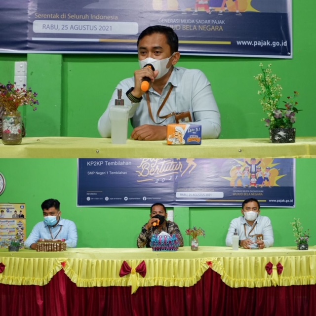 Kantor Pelayanan, Penyuluhan, dan Konsultasi Perpajakan (KP2KP) Tembilahan menggelar Pajak Bertutur 2021 dengan tema ''Generasi Muda Sadar Pajak, Wujud Bela Negara" dengan menggandeng SMP Negeri 1 Tembilahan, Kabupaten Indragiri Hilir, Riau (Rabu, 25/8). Sebanyak 30 siswa hadir pada acara ini. Acara berlangsung dengan baik dan lancar dengan tetap memperhatikan protokol kesehatan.